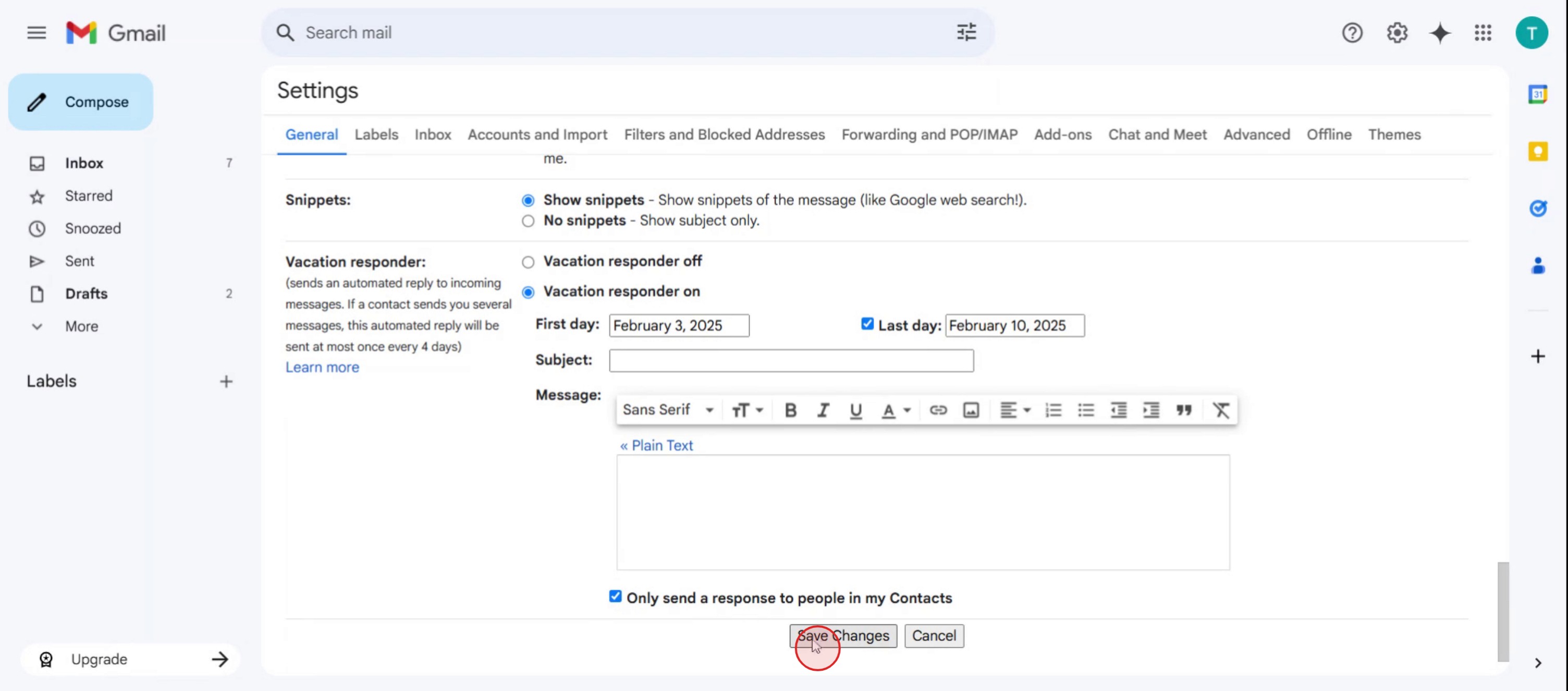 يمكنك اختيار إرسال الردود فقط إلى جهات الاتصال لديك، مما يساعد على تجنب الرد على النشرات الإخبارية أو الرسائل غير المرغوب فيها.هل يمكنني تضمين تنسيق وروابط في ردودي التلقائية؟