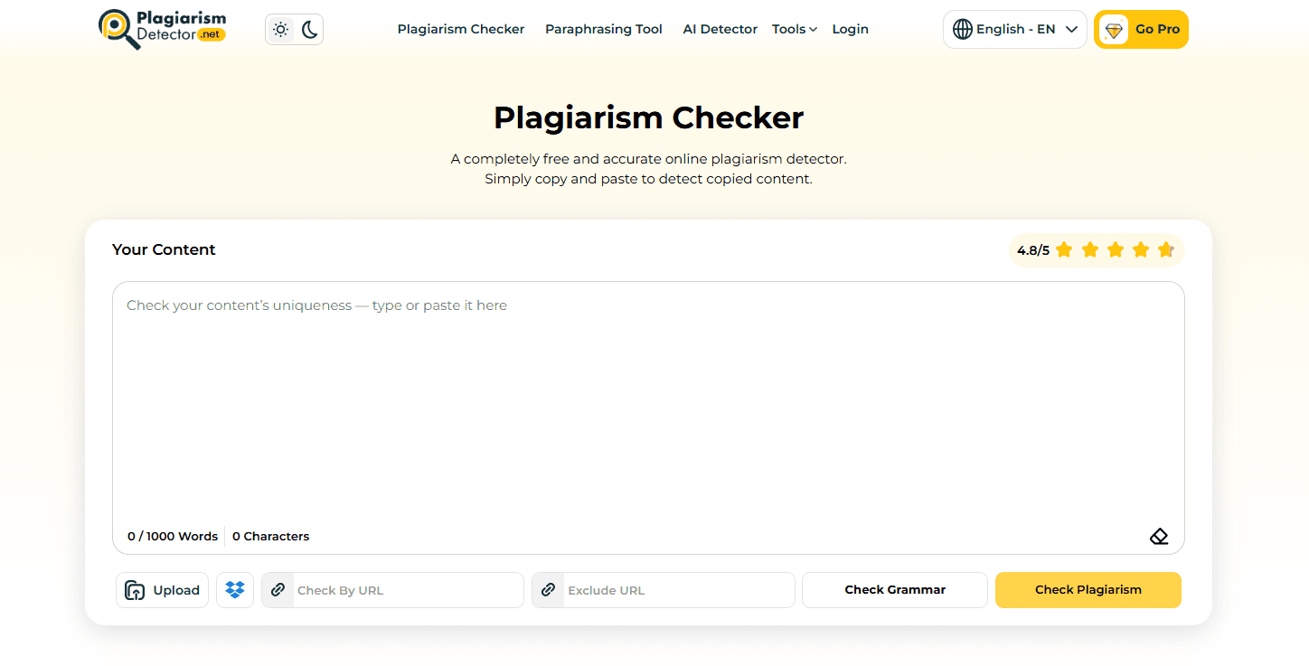Plagiarismdetector.net also offers a free plan, allowing users to test its core features with a limited number of daily checks. It’s a great starting point for students or first-time users who want to experience the tool before committing to a paid subscription.