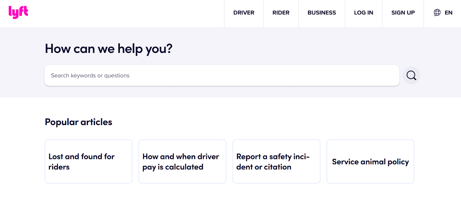 Lyft nails it when it comes to making its knowledge base mobile-friendly. Right at the top of the page, there's a clear, easy-to-spot search bar to help users get started. Just below that, they’ve laid out popular articles and grouped content into helpful categories.