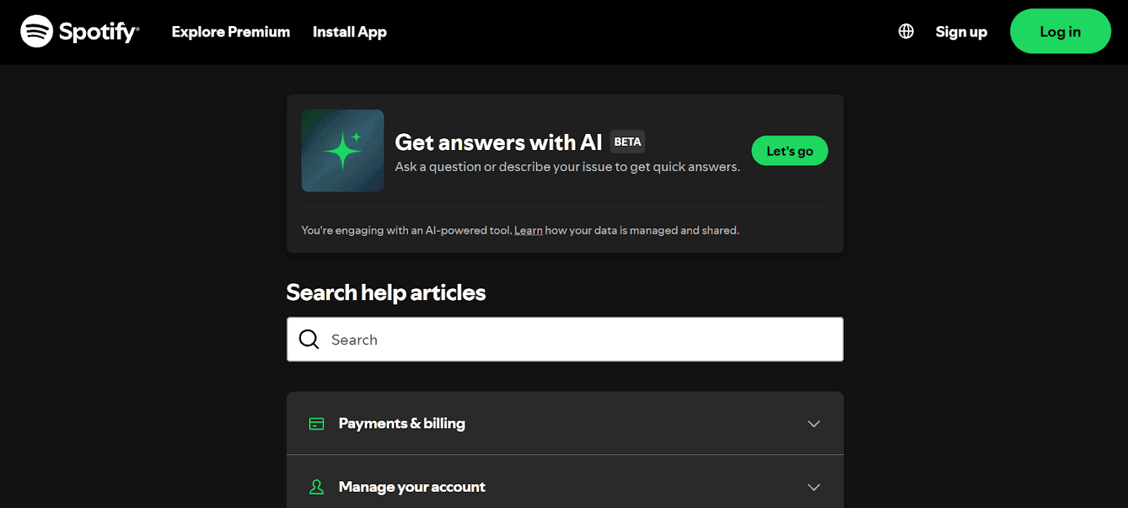 Spotify’s knowledge base does a great job of staying true to its brand. It uses their signature colors throughout, and everything is easy to navigate and understand. Right at the top, there’s a big search bar to help you quickly find what you need, and they even encourage you to log in so you can get help faster.