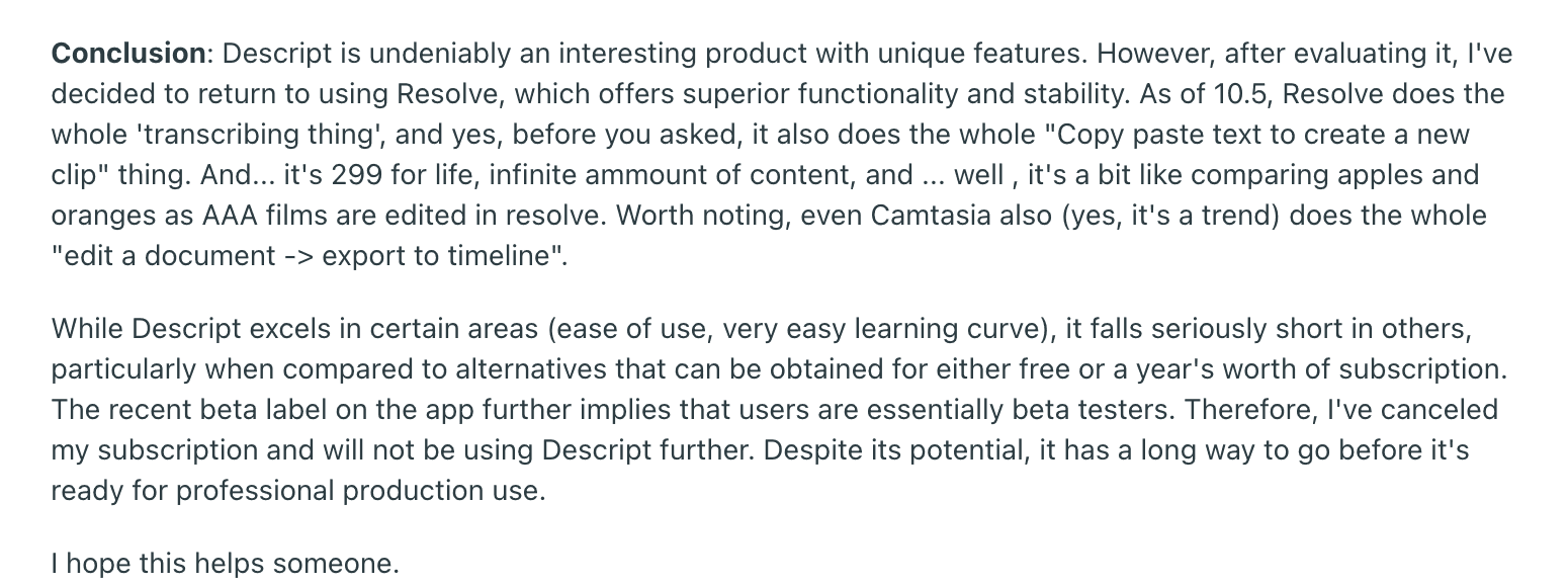 Descript enjoys a healthy 4.8 rating on Capterra. Below is one of the reviews shared by a user on Reddit.
