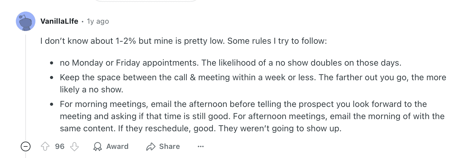 📚 In Practice: Some reps cut no-shows by avoiding Monday/Friday meetings, keeping scheduling within a week, and sending quick reminders the day before for mornings or same-day for afternoons.