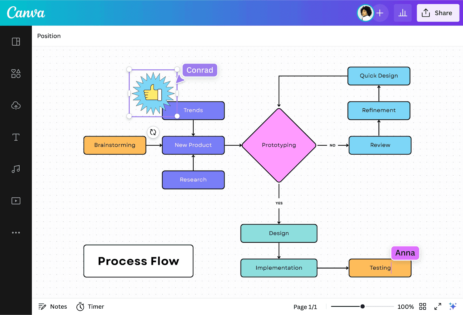 Canva is a graphic design platform. With its vast library of pre-made templates, vector art, fonts, and styling effects, you can create a process plan however you like. Track progress effortlessly with color-coded cursors, timers, and interactive comments.