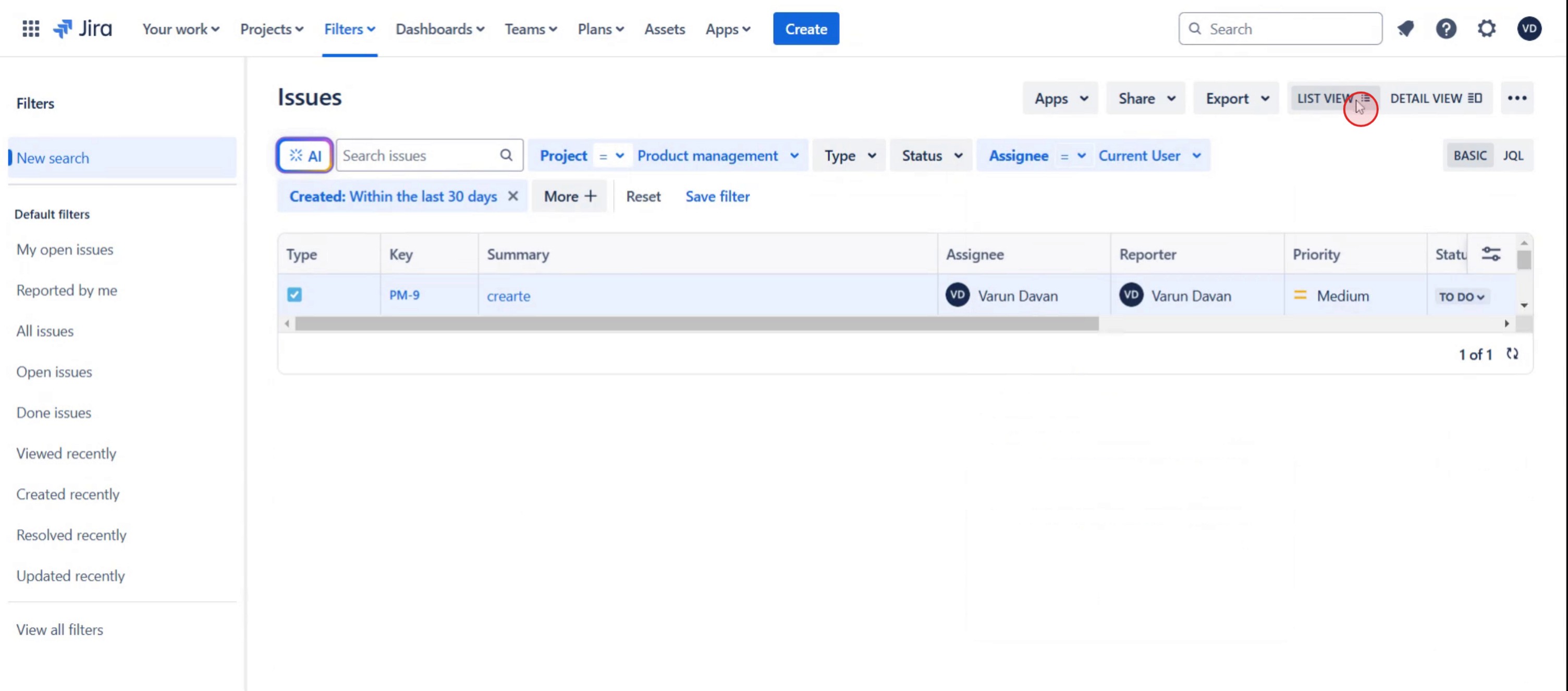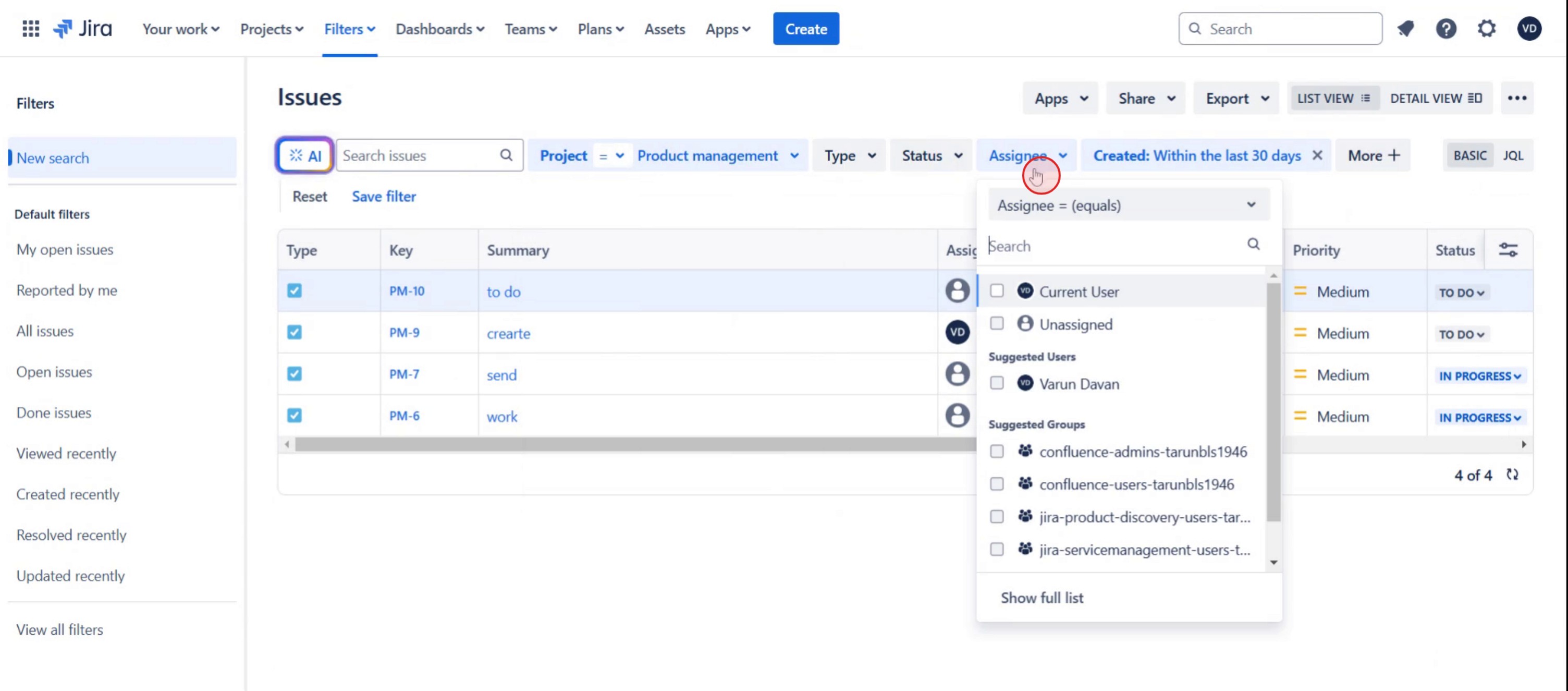 利用 Jira 的搜索功能和筛选器——你可以在搜索中使用经办人字段或 Jira 查询语言(JQL)轻松筛选分配给你的工单,从而缩小结果范围。