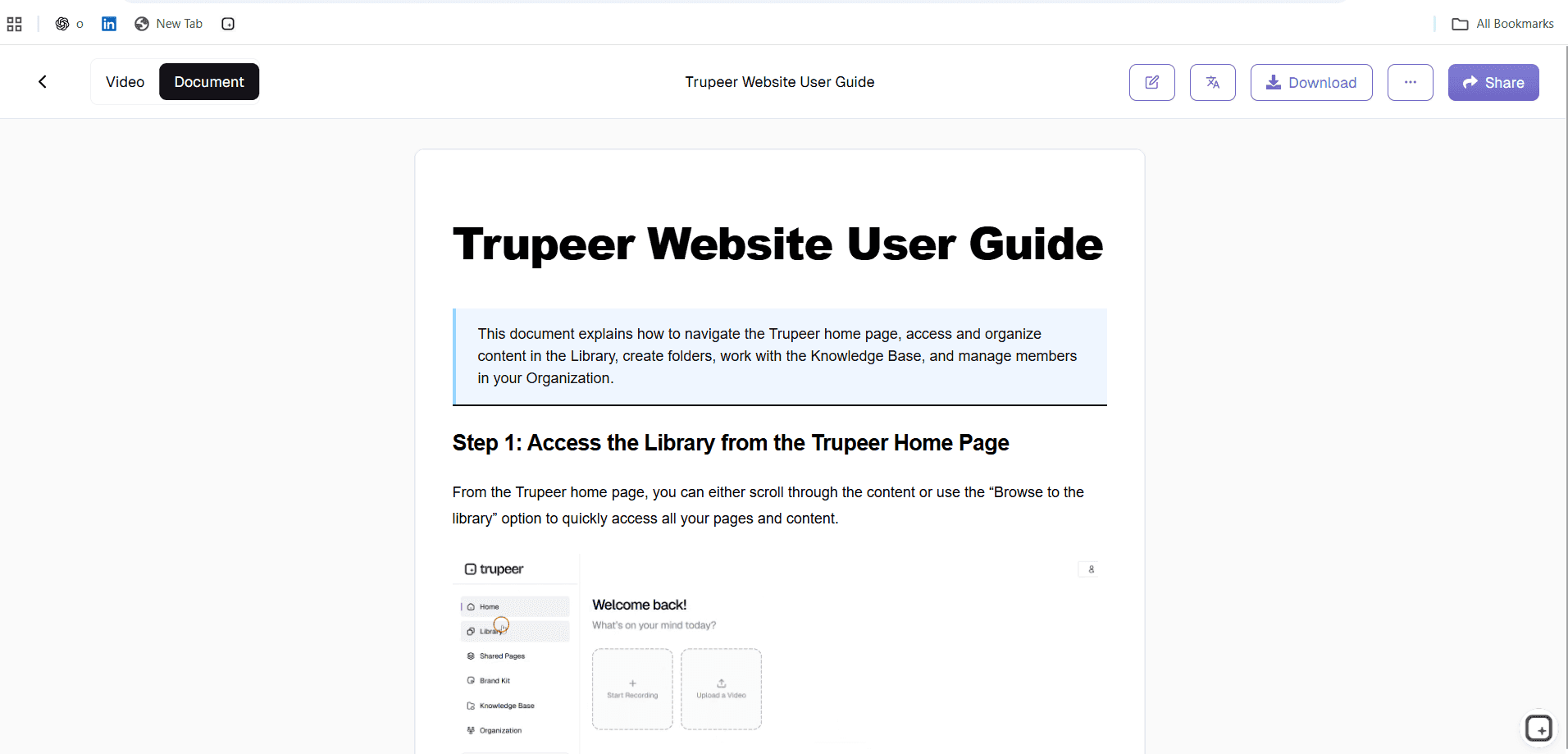 Was Trupeer von anderen Dokumentengeneratoren unterscheidet, ist unser Dual-Output-Ansatz. Sie erhalten nicht nur ein Dokument oder nur ein Video – Sie bekommen beides. Zeichnen Sie einmal mit unserem Bildschirmrekorder auf, und unsere KI erstellt ein ausgefeiltes Video zusammen mit umfassender schriftlicher Dokumentation. Das macht es ideal für Teams, die mehrere Inhaltsformate für unterschiedliche Zielgruppen und Anwendungsfälle benötigen.