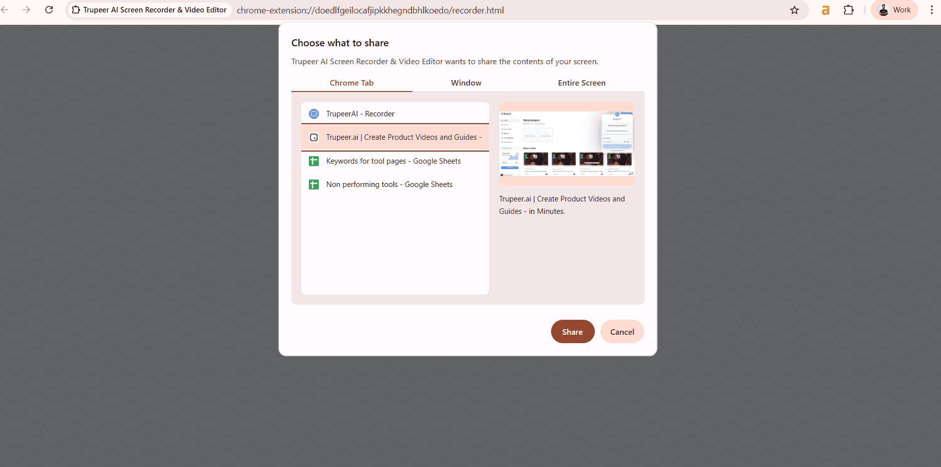 Trupeers Browser-Bildschirmrekorder erfasst Browsertabs, Anwendungen oder den gesamten Bildschirm direkt in Chrome, Firefox und modernen Browsern mithilfe einer leichten Erweiterung. Dieses Tool zeichnet Workflows, Demos und Tutorials mit KI-gestützten Verbesserungen auf, darunter automatische Untertitel, Anmerkungen und Cloud-Freigabe ohne Installation von Desktop-Software.