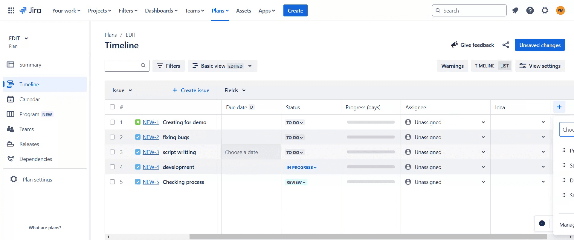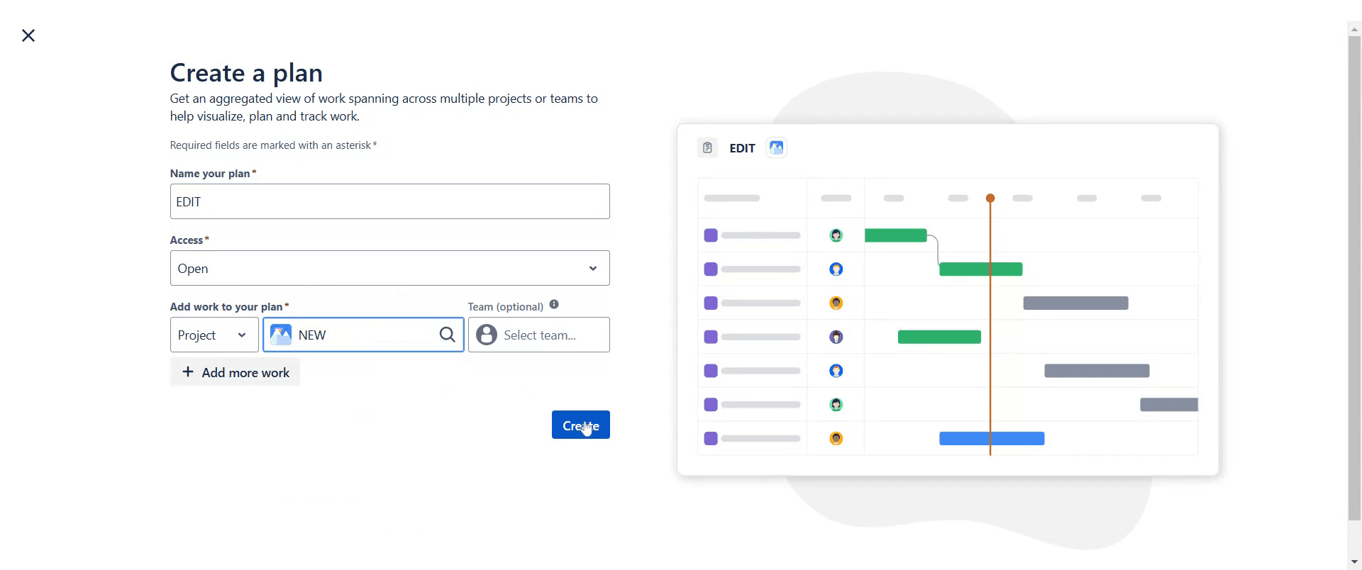 Navigieren Sie zu Plans > Create a plan, um Advanced Roadmaps für die Projektplanung und -verfolgung zu verwenden.