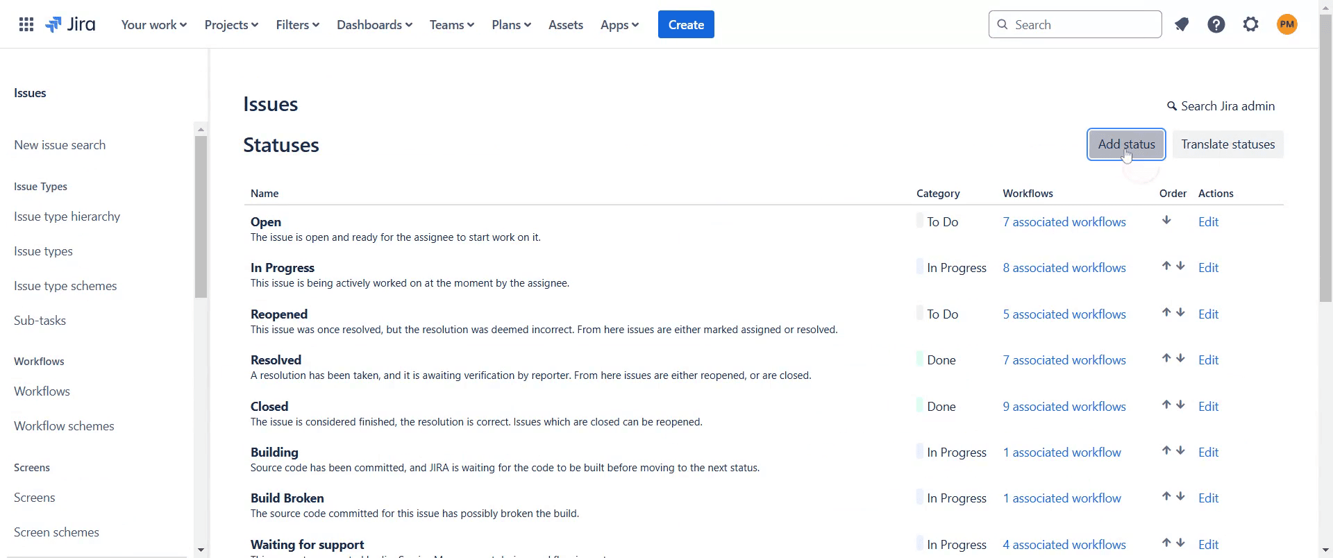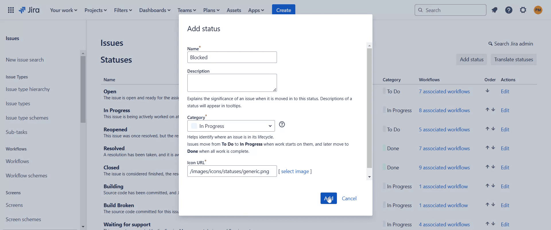 Gehen Sie zu den Jira-Einstellungen, öffnen Sie Workflows, bearbeiten Sie den gewünschten Workflow und fügen Sie einen neuen Status mit dem Namen Blocked hinzu.Kann ich die Farbe des blockierten Status ändern?
