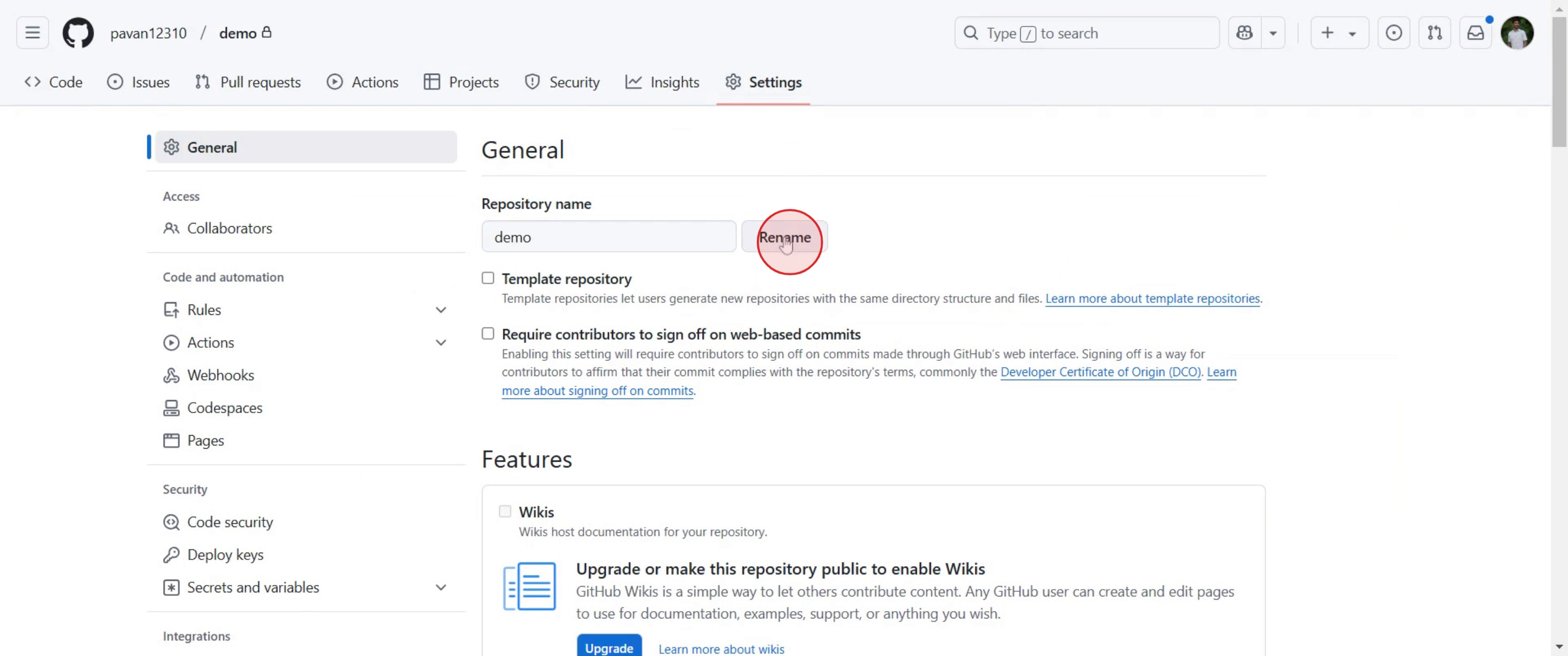 Navigieren Sie zur Registerkarte "Einstellungen" des Repositorys und aktualisieren Sie den Repository-Namen im Abschnitt "Allgemein".