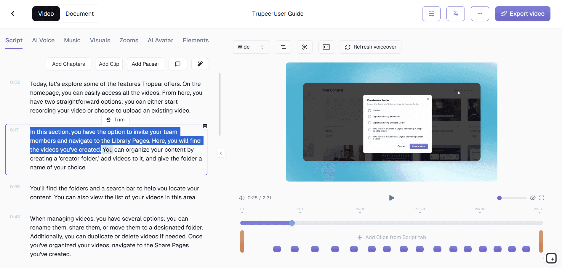 Utiliza las funciones avanzadas: Explora las capacidades de traducción de Trupeer para públicos internacionales, prueba distintas configuraciones de kits de marca para varios casos de uso e integra contenido de vídeo en estrategias de documentación más amplias. Estas funciones avanzadas multiplican el valor de tus esfuerzos de creación de contenido sin perder la eficiencia conseguida.