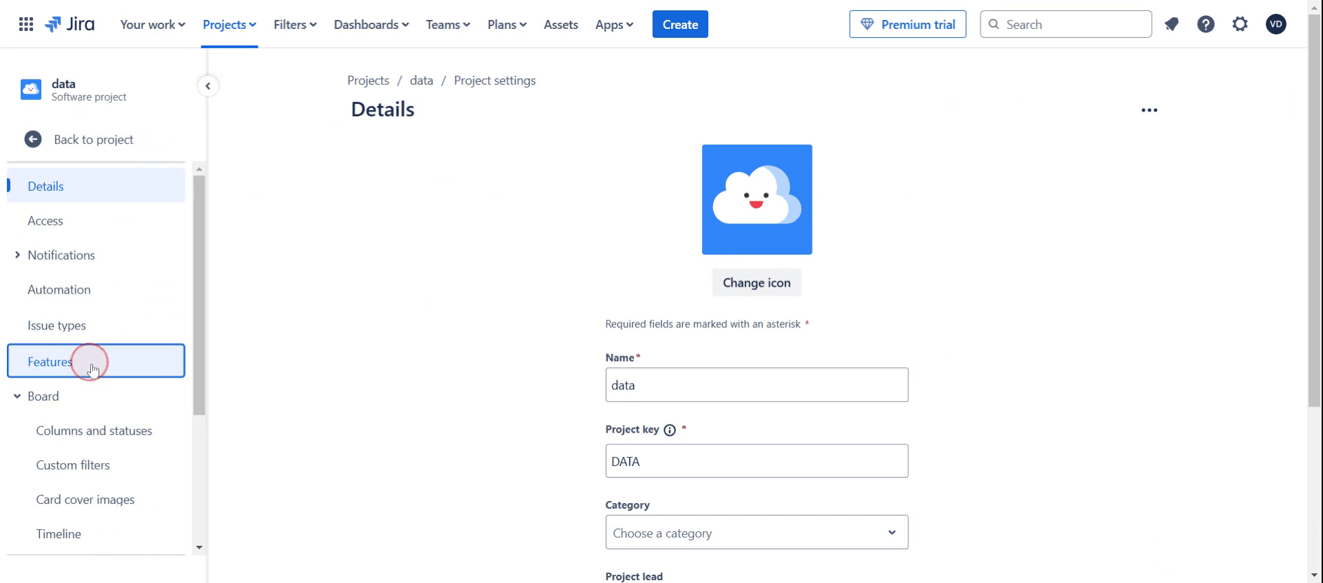 Selecciona la opción Features,