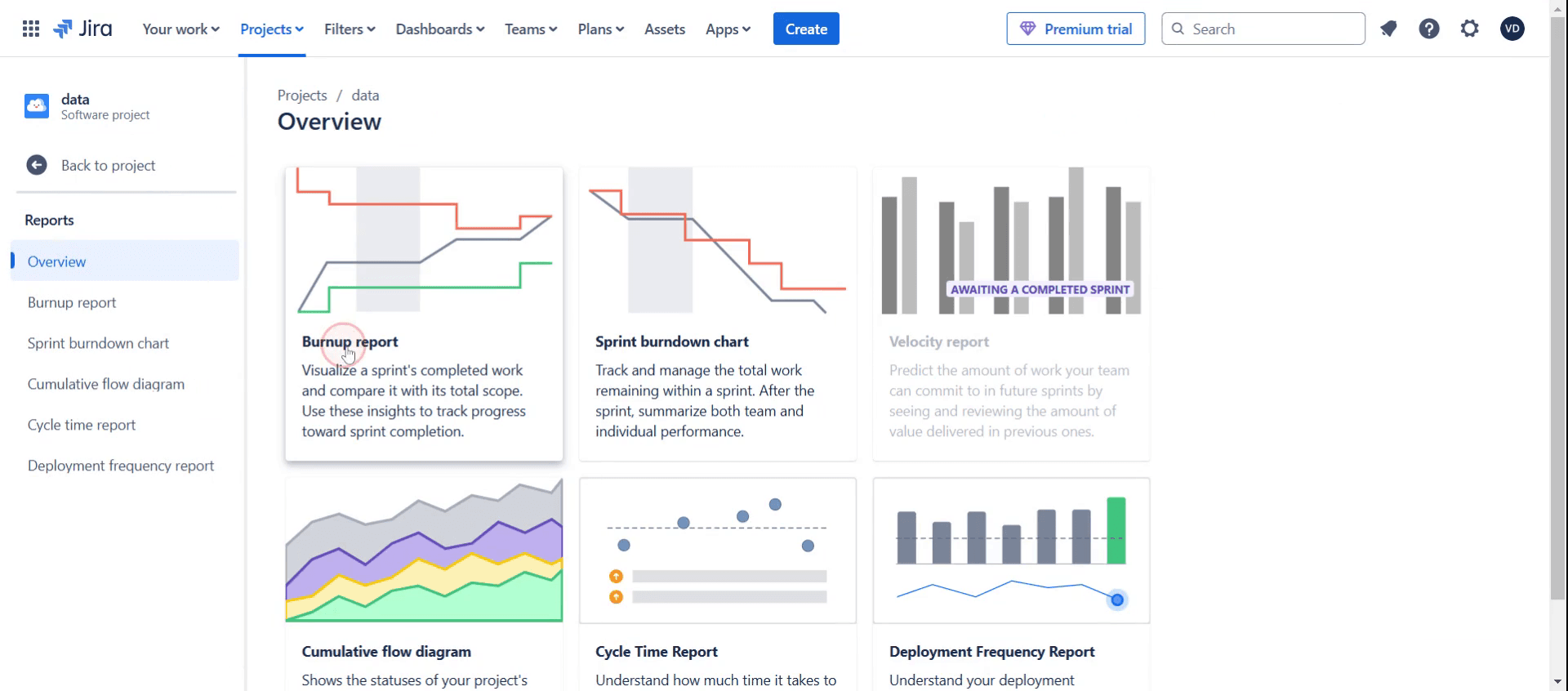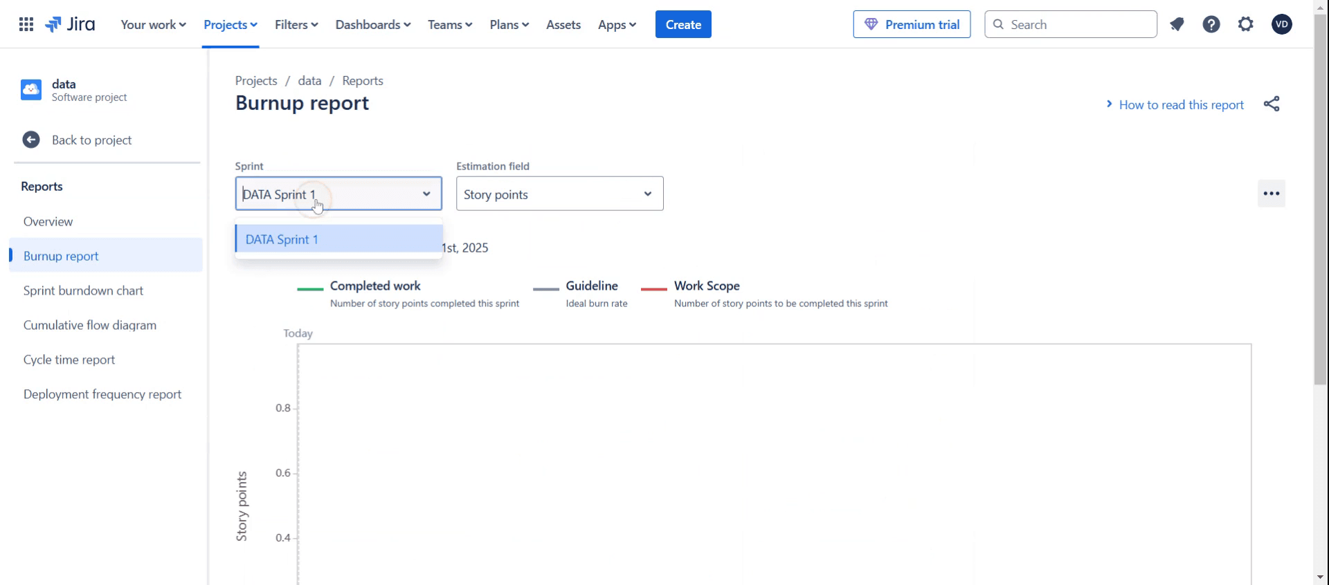 Usa el Informe de Sprint en la sección de Informes de Jira para acceder rápidamente a los detalles de sprints pasados, incluidas las tareas completadas y las tendencias de velocidad.