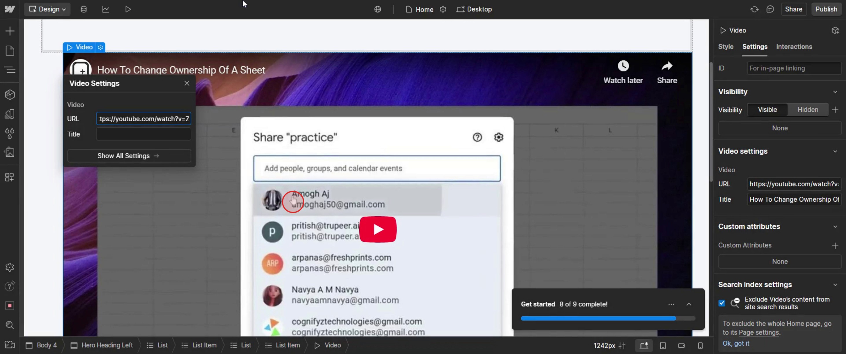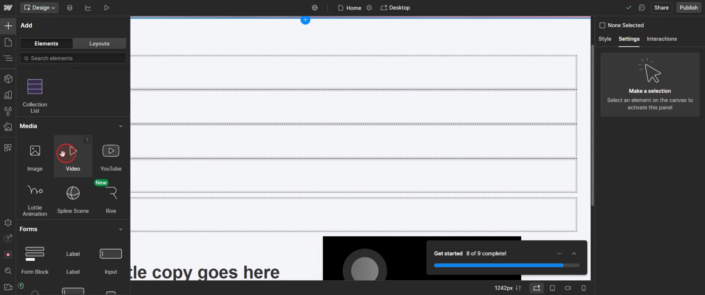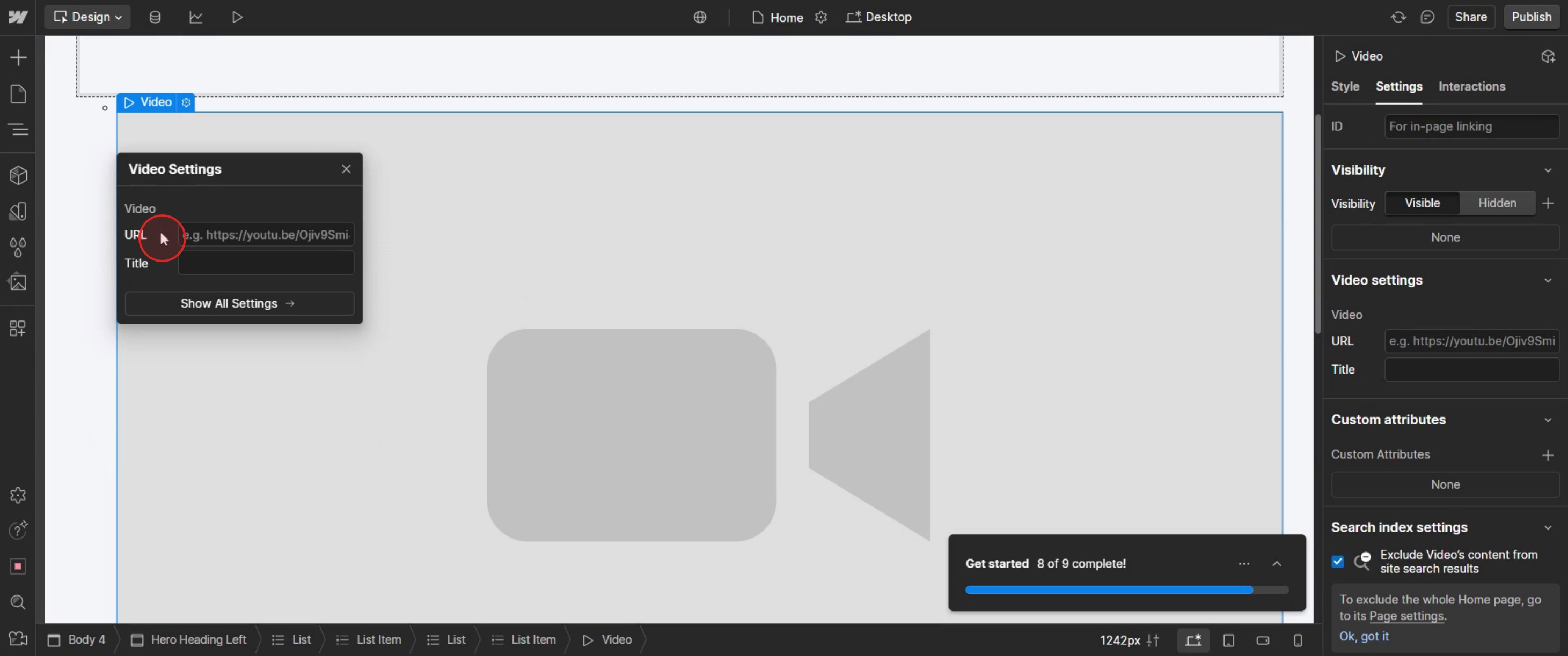 Usa el elemento de vídeo integrado de Web flow para mayor simplicidad – Web flow ofrece un elemento de vídeo que te permite incrustar fácilmente enlaces de YouTube, Vimeo o vídeos personalizados.