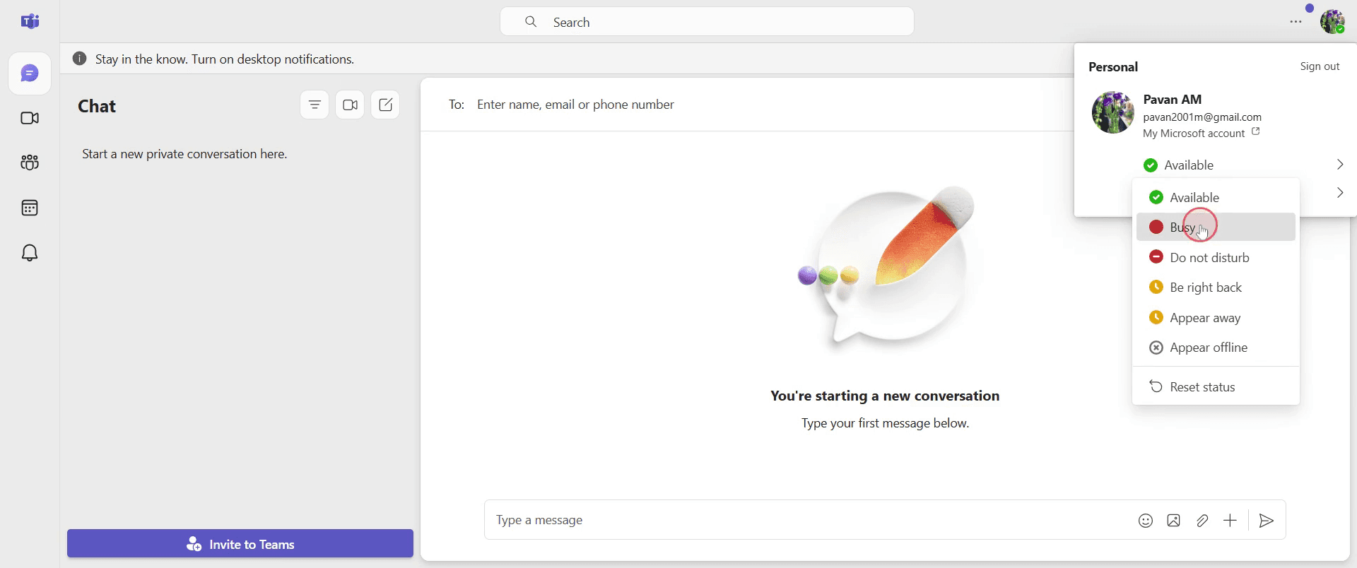 Haz clic en "Disponible" para establecer tu estado.
