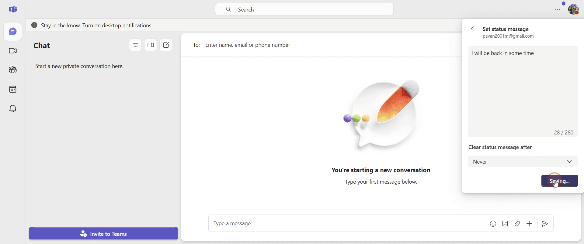 Sí, ve a tu perfil, haz clic en “Establecer mensaje de estado”, escribe tu mensaje y guárdalo¿Cómo configuro mi estado en No molestar en Teams?