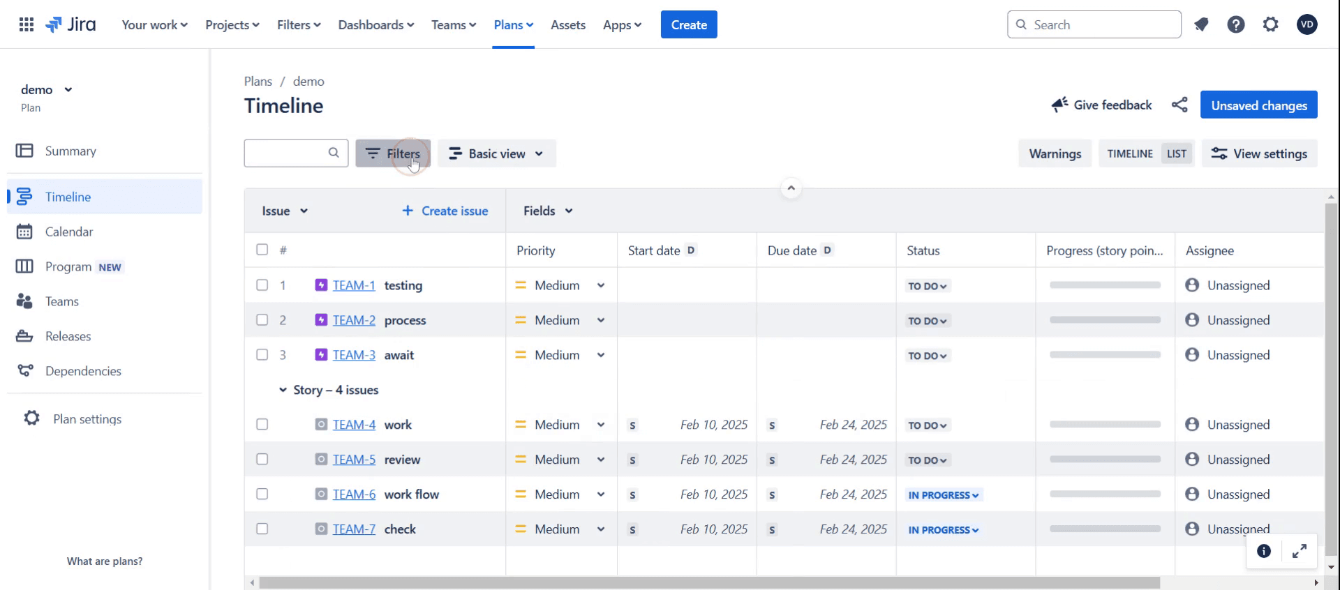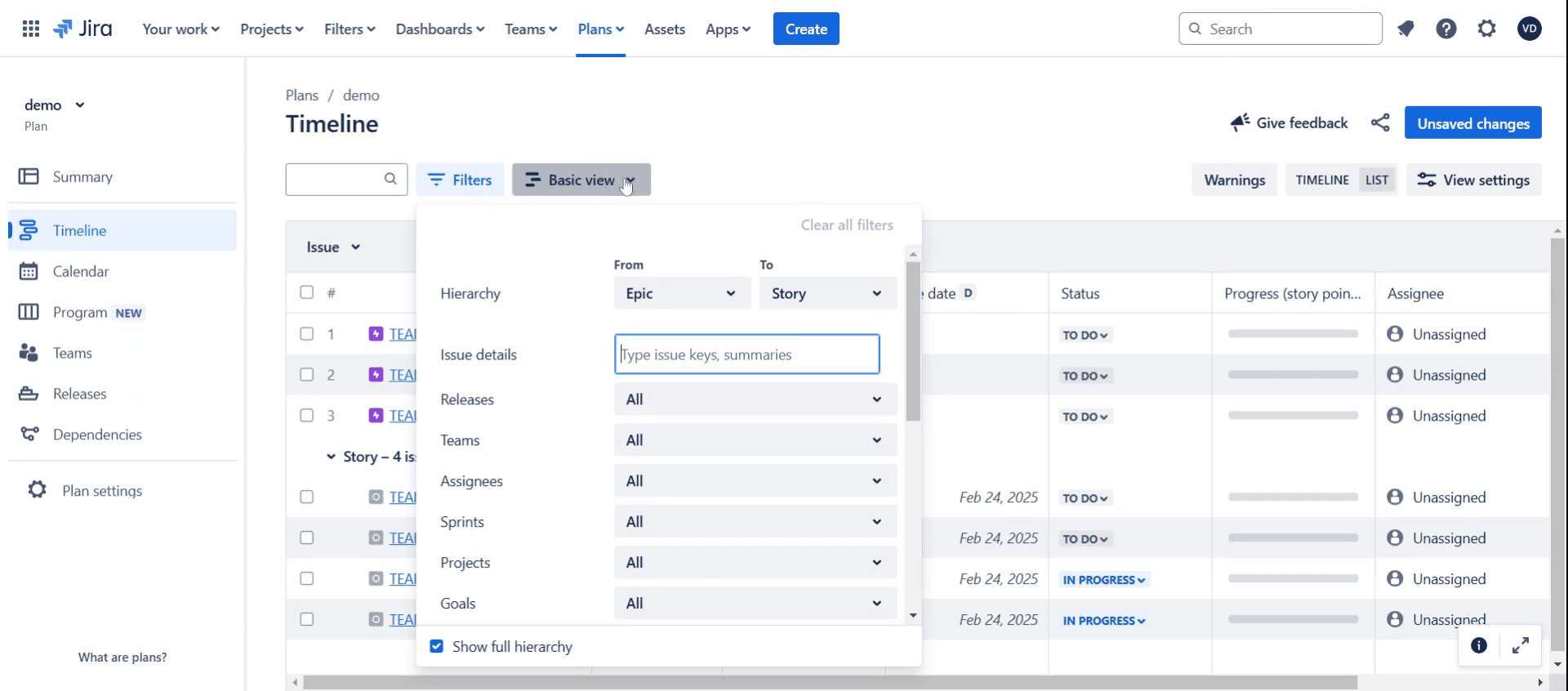 Personaliza la vista de tu hoja de ruta – Jira te permite filtrar por equipos, proyectos y cronogramas para centrarte en los datos relevantes. Usa los filtros adecuados para obtener una vista clara.