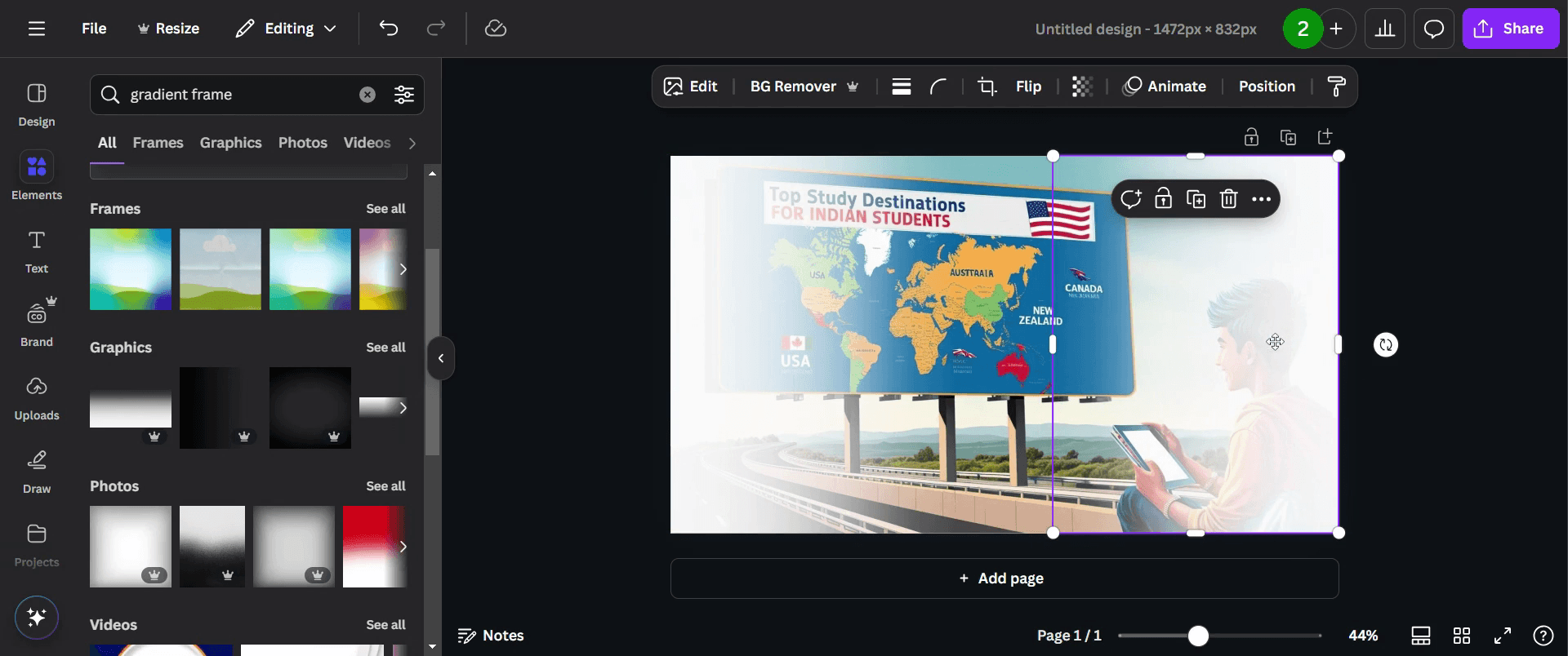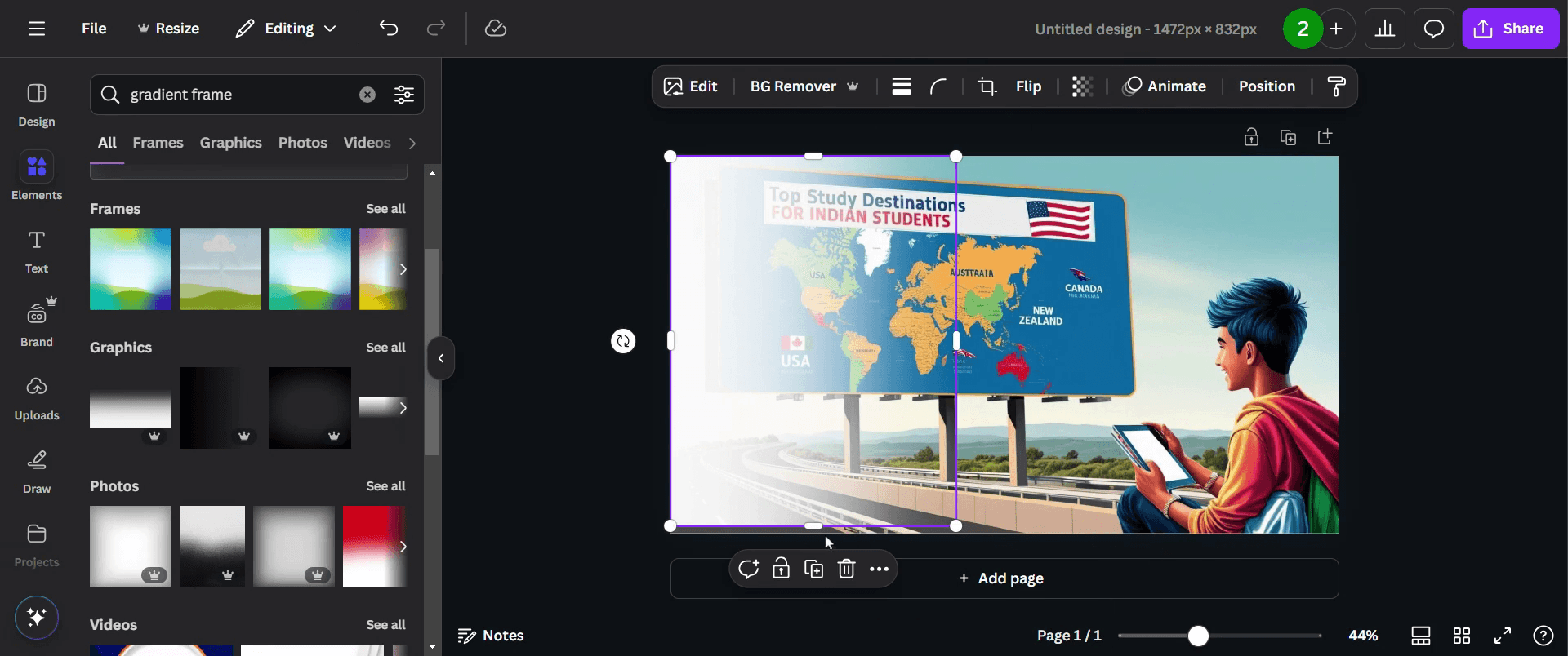 Para difuminar los bordes de una foto, usa el efecto Degradado integrado de Canva en la sección Efectos para fusionarla fácilmente con el fondo.