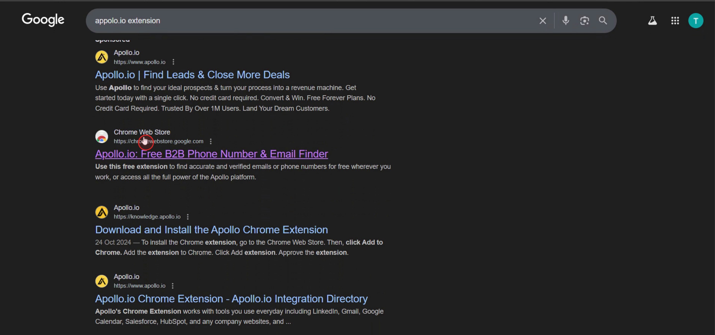 En la barra de búsqueda, escribe extensión de Apollo.io para Chrome.