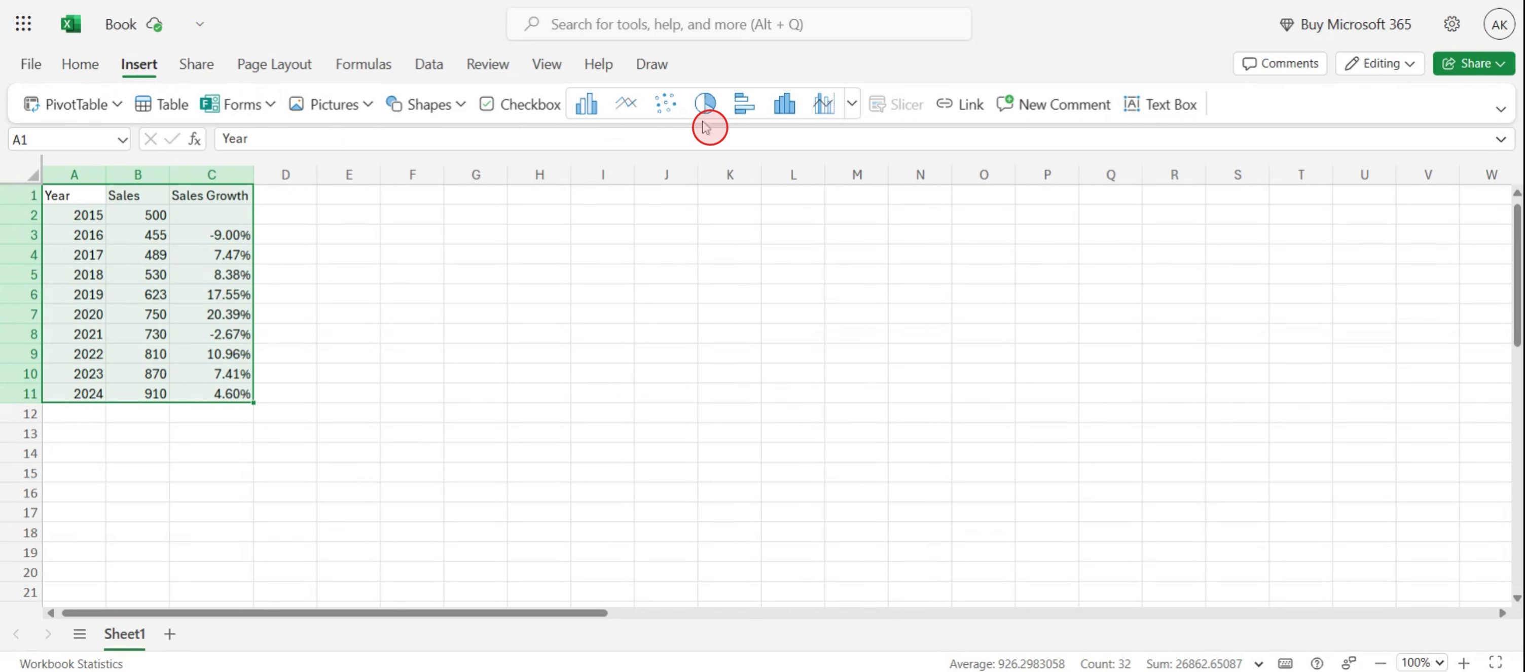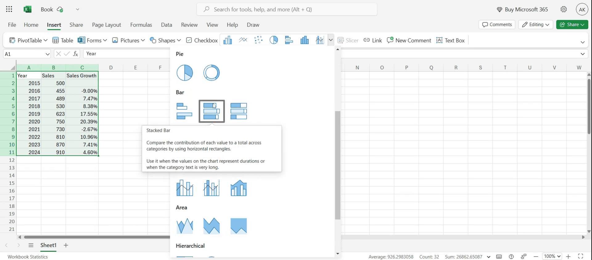 Dentro del menú Insertar, encontrará una variedad de opciones de gráficos.