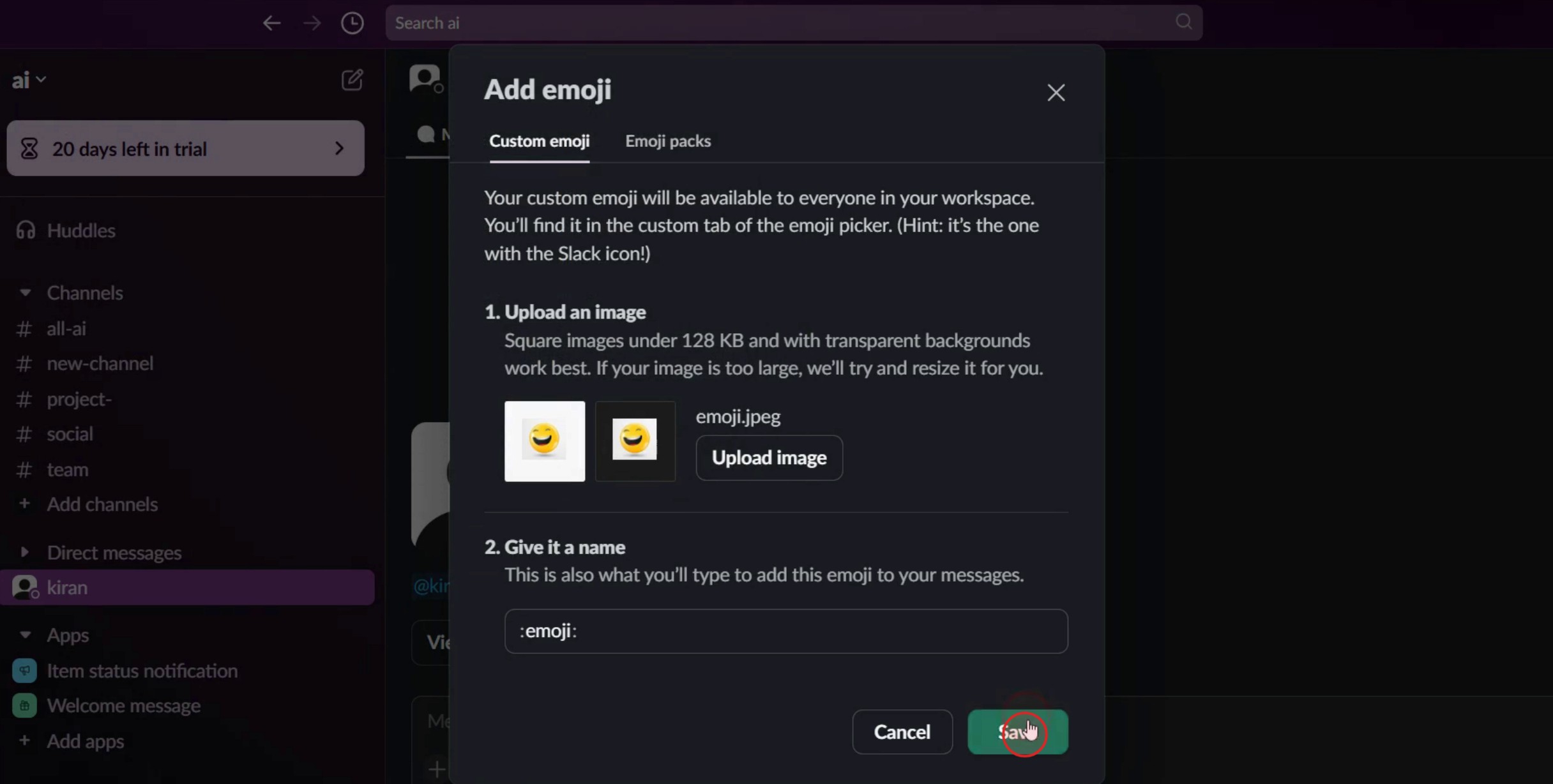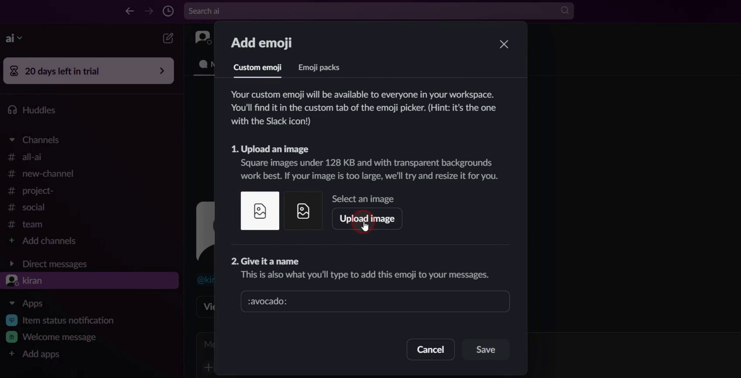 Optimice el tamaño para una mejor visibilidad – Slack redimensiona los emojis a 128x128 píxeles, por lo que subir una imagen correctamente recortada y escalada garantiza claridad.