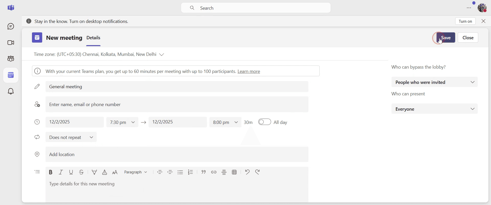 Una vez que haya finalizado todos los detalles, haga clic en "Guardar" para programar la reunión.