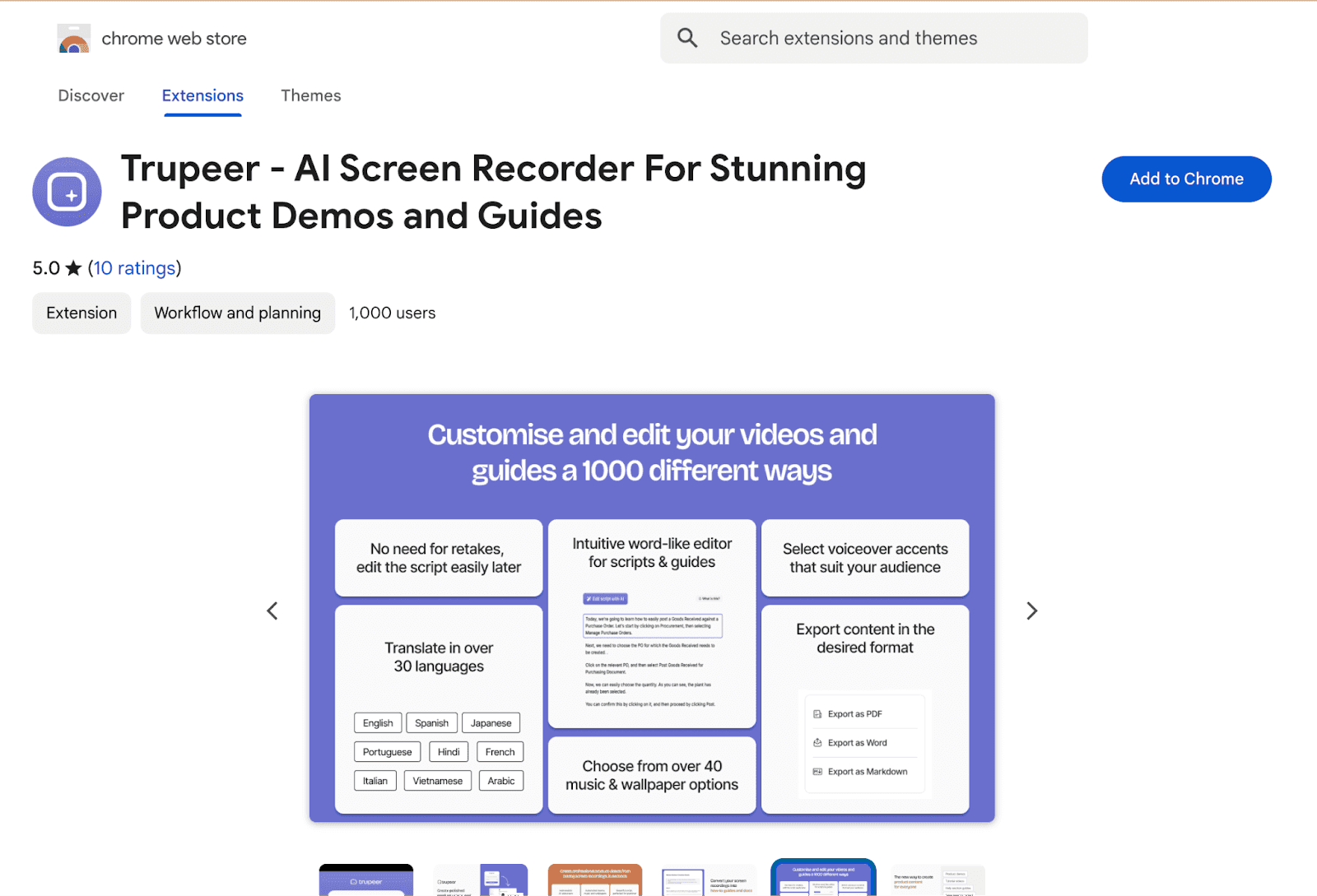 Ajouter Trupeer à Chrome est rapide et facile. Il suffit d'installer l'extension, de l'épingler à votre barre d'outils et de commencer à enregistrer d'un simple clic. Une fois votre enregistrement terminé, vous pouvez en améliorer la qualité sans effort avec l'éditeur vidéo alimenté par l'IA de Trupeer et même traduire le script dans plus de 65 langues, gratuitement.