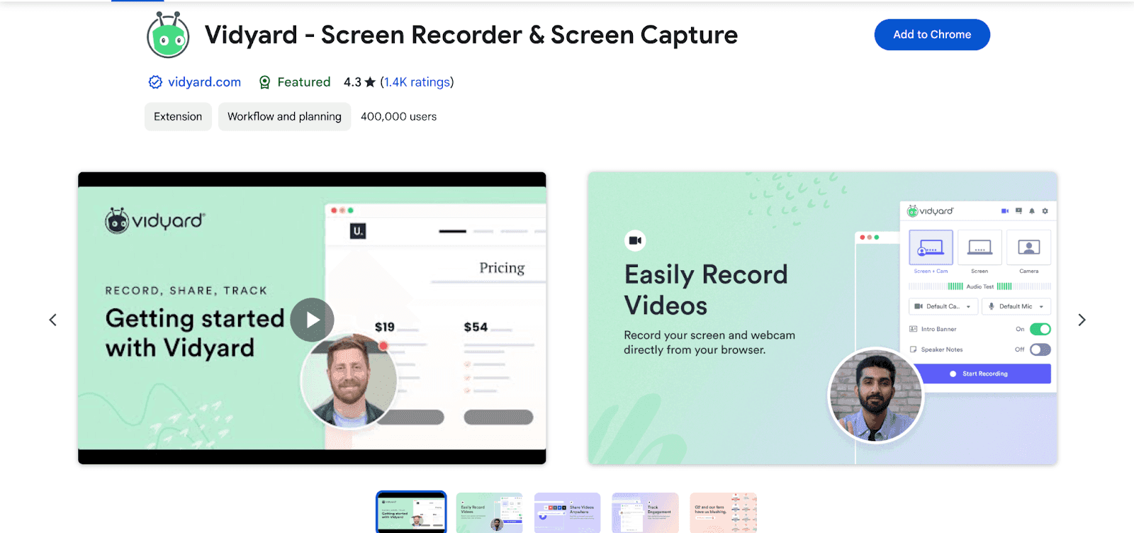 Vidyard fournit une extension d'enregistrement d'écran simple mais efficace pour Chrome, facilitant la création de contenus vidéo de haute qualité en quelques clics. Vous pouvez enregistrer votre écran, ajouter des notes vocales et dessiner à l'écran pour enrichir vos vidéos. Vidyard vous permet également de suivre qui regarde vos vidéos et combien de temps ils interagissent, offrant ainsi des informations précieuses pour vos communications.