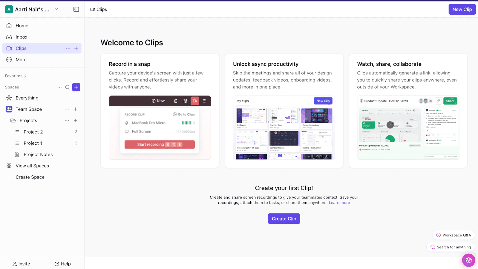 ClickUp Clips propose un outil d'enregistrement d'écran de niveau professionnel qui s'intègre parfaitement à la plateforme de gestion de projet de ClickUp. Cette extension Chrome gratuite vous permet d'enregistrer et de partager rapidement des enregistrements d'écran de haute qualité, que vous ayez besoin de les envoyer par lien, e-mail ou directement via la fonctionnalité e-mail de ClickUp. Vous pouvez capturer l'intégralité de votre écran, un onglet spécifique ou l'écran d'un appareil, sans restriction de durée, ce qui garantit que vous pouvez enregistrer aussi longtemps que nécessaire.
