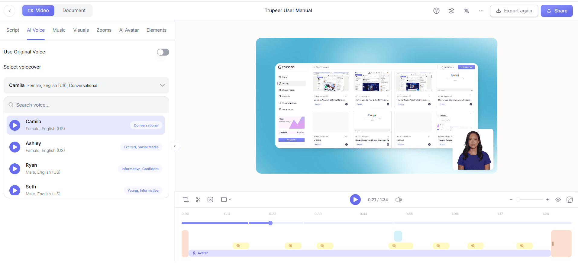 Ensuite, intégrez une voix off à l’aide de la voix off IA de Trupeer dans plus de 50 voix naturelles. Choisissez une voix adaptée à votre marque ou à votre public en accédant à la section « Voiceover ». Vous pouvez y sélectionner différentes options et ajuster le rythme et le ton selon les besoins. Cette fonctionnalité est particulièrement utile pour rendre la vidéo de formation accessible aux locuteurs non natifs, car vous pouvez associer la voix off à des sous-titres correspondants si nécessaire. L’IA s’occupe de tout cela sans difficulté, vous permettant de vous concentrer sur le contenu plutôt que sur les détails techniques. L’ensemble du processus d’ajout d’une voix off prend environ 20 minutes.