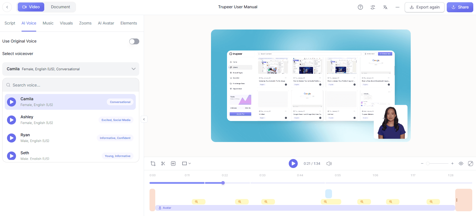 Après l’enregistrement, améliorez votre démonstration avec la voix off IA de Trupeer. Choisissez parmi plus de 50 voix naturelles et ajustez le rythme et le ton pour correspondre aux préférences de votre audience cible. Pour ajouter une voix off, accédez à la section d’édition et sélectionnez « Ajouter une voix off ». Choisissez la voix de votre choix, et l’IA l’intégrera harmonieusement à votre vidéo. Cette fonctionnalité permet non seulement de gagner du temps, mais aussi d’apporter une touche professionnelle. Elle est particulièrement bénéfique pour les audiences internationales, car elle peut être synchronisée avec les fonctionnalités de traduction IA pour les prospects non anglophones. Les équipes qui comparent les outils commencent souvent par un comparatif des alternatives à Loom avant de standardiser un flux de travail.
