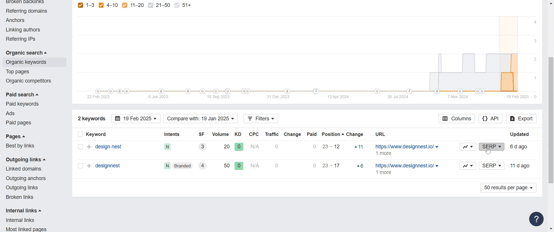Seleziona una parola chiave che vuoi monitorare e fai clic sul pulsante SERP sulla destra.