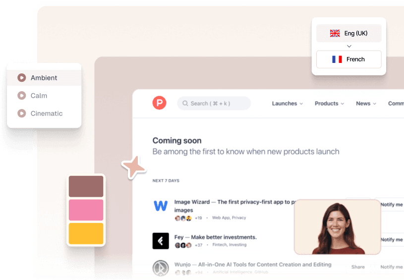Defina o seu logótipo, cores e tom de voz uma vez. Cada vídeo da sua equipa parece ter saído do mesmo estúdio.
