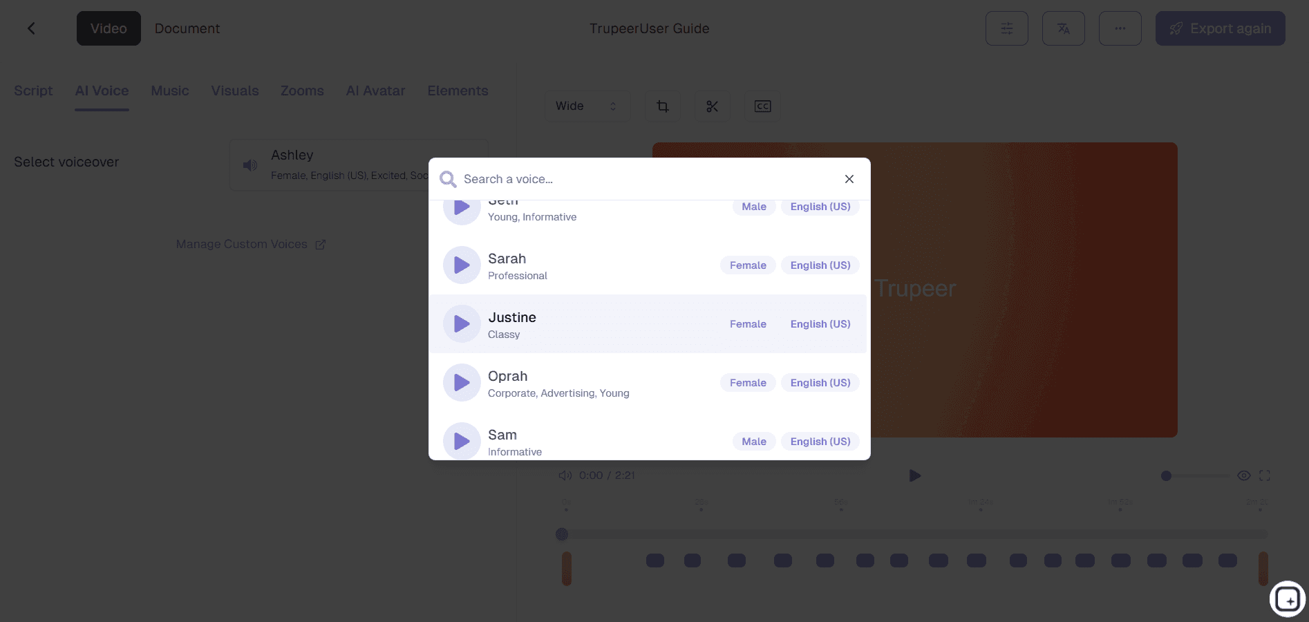 O criador de vídeos empresariais da Trupeer converte automaticamente esquemas de texto, conjuntos de diapositivos ou conteúdo gravado em vídeos corporativos polidos, completos com narrações por IA, visuais com a marca e transições profissionais. O criador de vídeos online trata de tudo, desde a escrita do guião até à exportação final, permitindo que qualquer pessoa crie um vídeo que corresponda instantaneamente aos padrões da empresa.