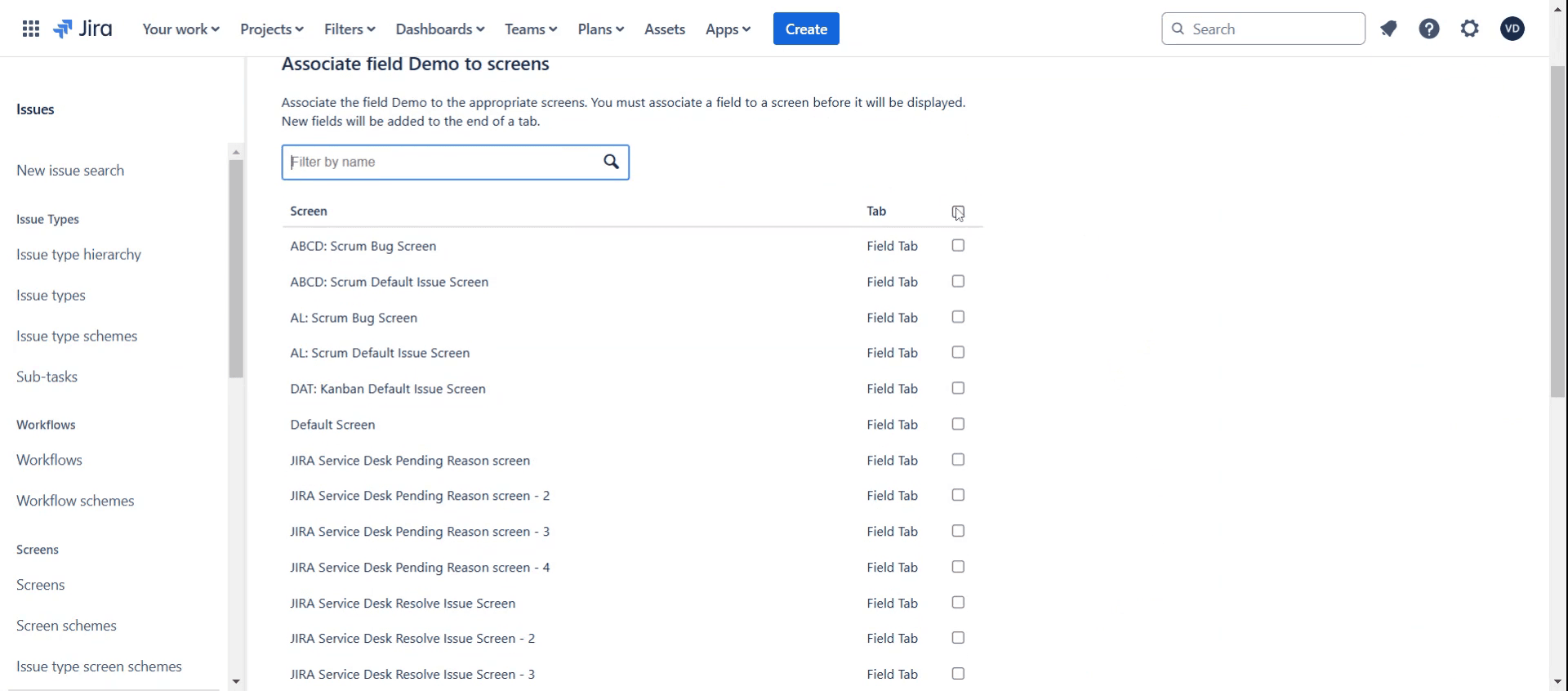 Add the Field to Screens – After creating the field, assign it to relevant screens under Jira Settings > Issues > Screens to make it visible when creating or editing an issue.