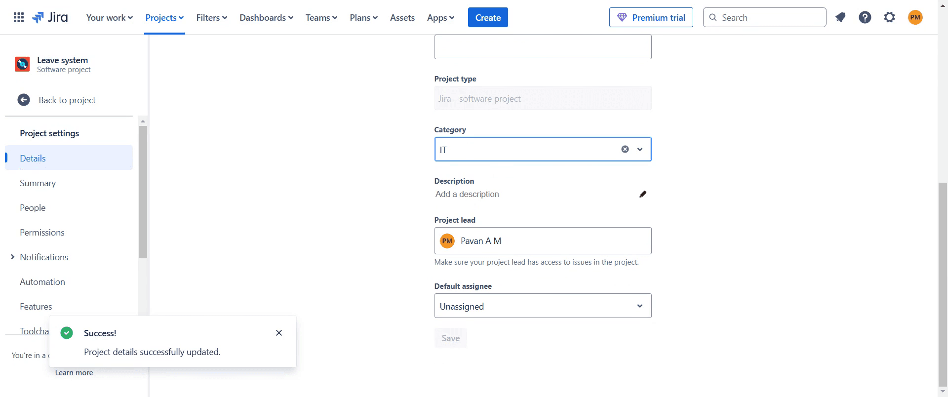 A pop-up will confirm that the project details have been successfully updated. Thank you.