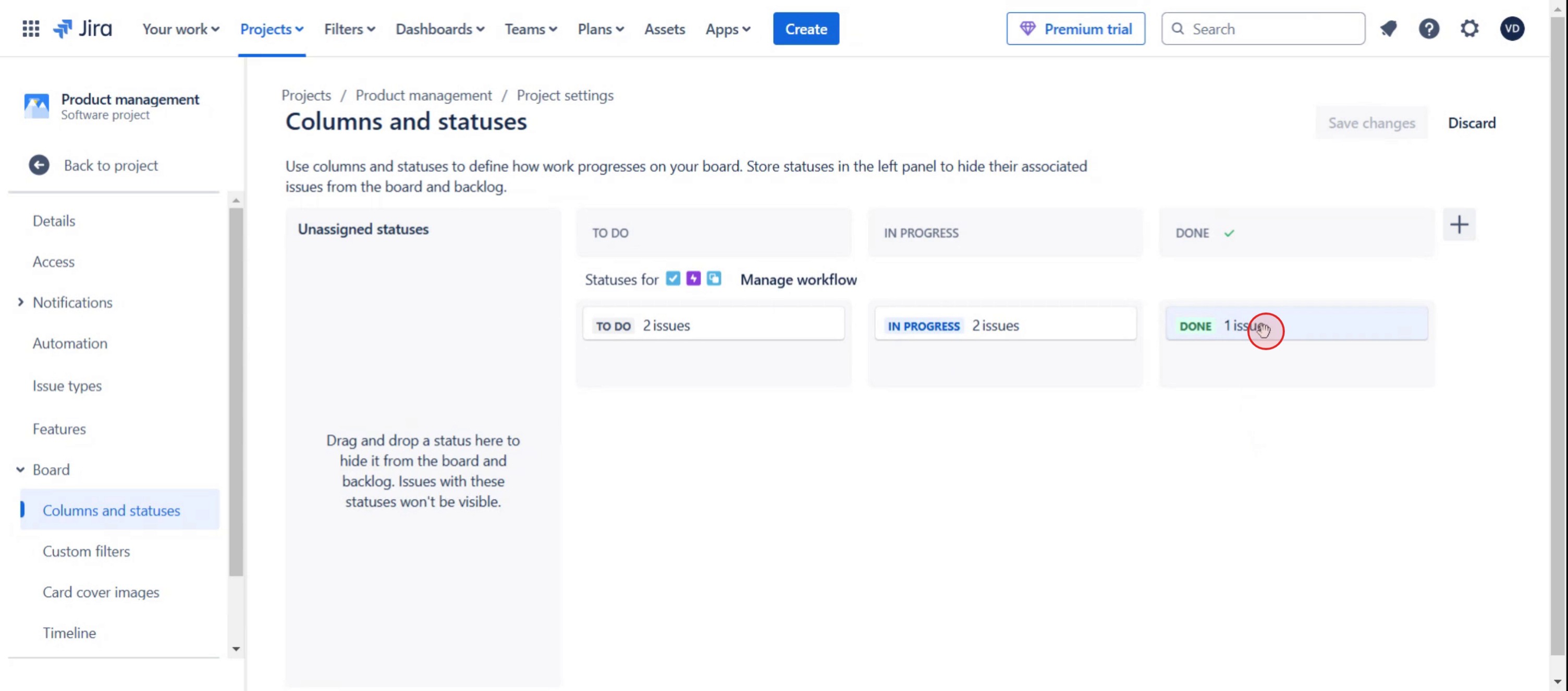 Use Jira’s board settings to map statuses correctly to columns for seamless issue tracking.