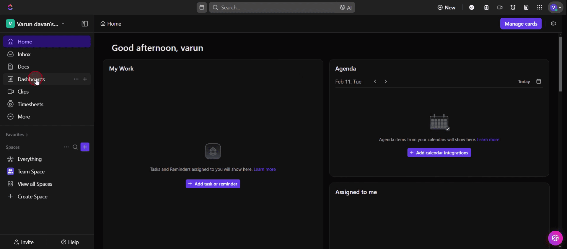 Use Click Up’s built-in widgets to customize your dashboard with tasks, goals, and workload views.