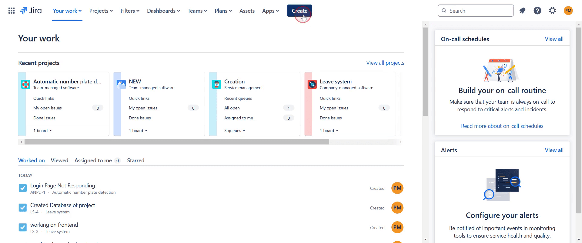 To begin creating a defect in Jira, click on the "Create" option.