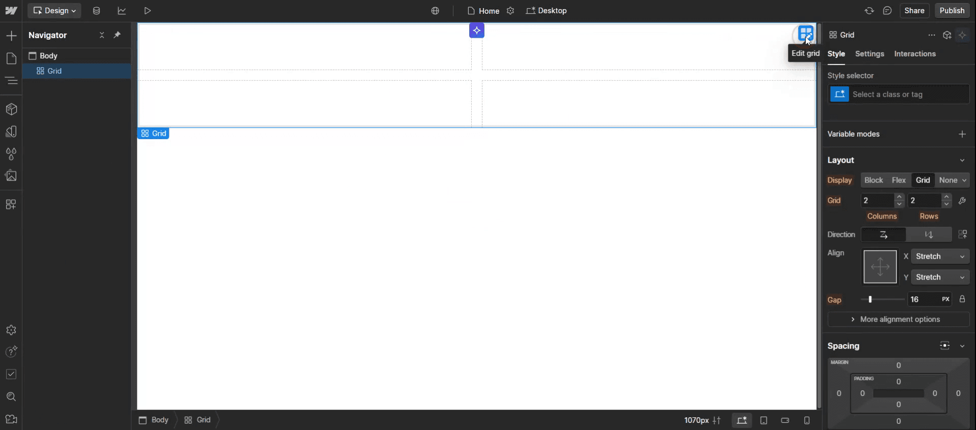 Use the Grid Layout for a Responsive Table – Web flow doesn’t have a built-in table element, but you can use CSS Grid to create a fully customizable and responsive table.