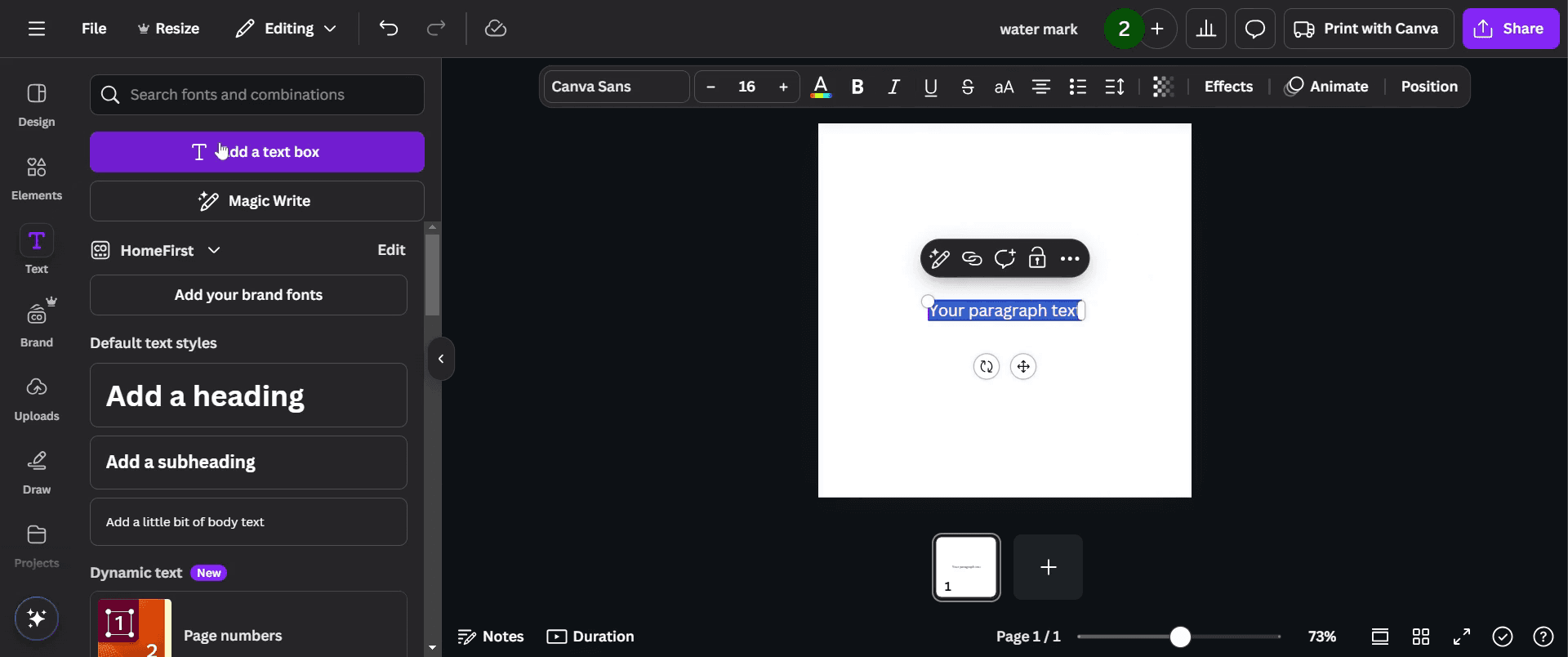 To create a watermark in Canva, start by navigating to the toolbar. Click on the 'Text' option.