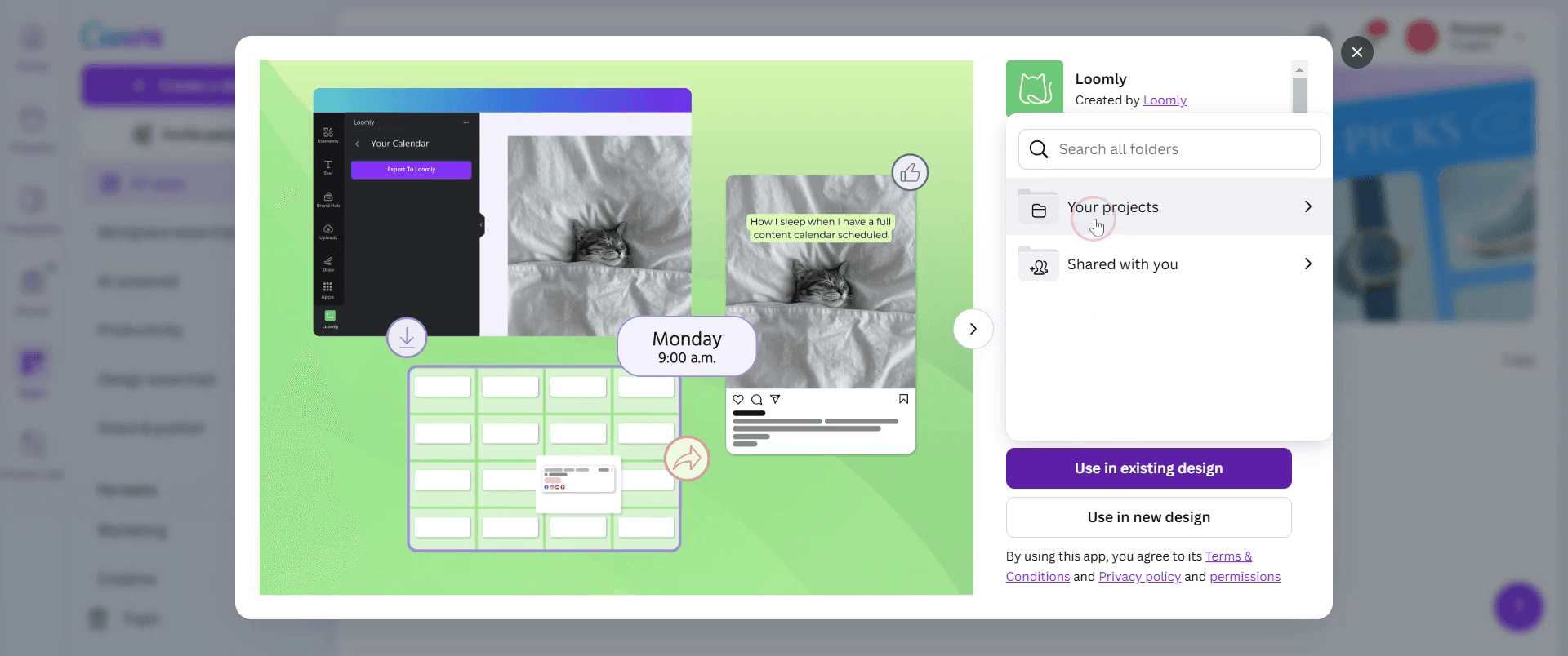 Organize your Canva assets in folders to easily locate and upload them to Loomly without delays.