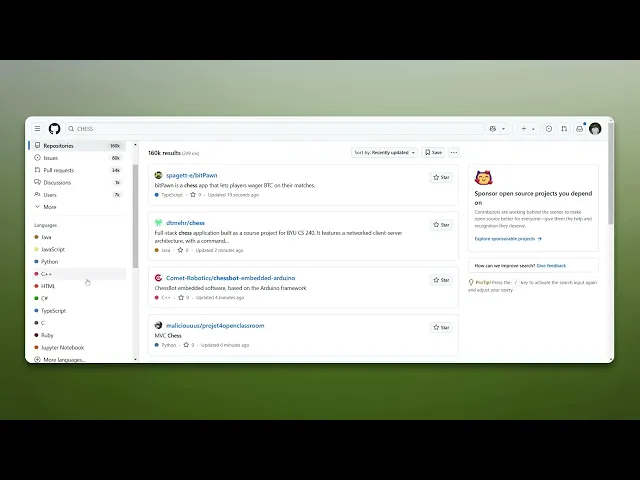 Yes, you can filter search results by language using the Languages filter on the left sidebar or by using the language: keyword in the search query.How can I find repositories with the most stars?