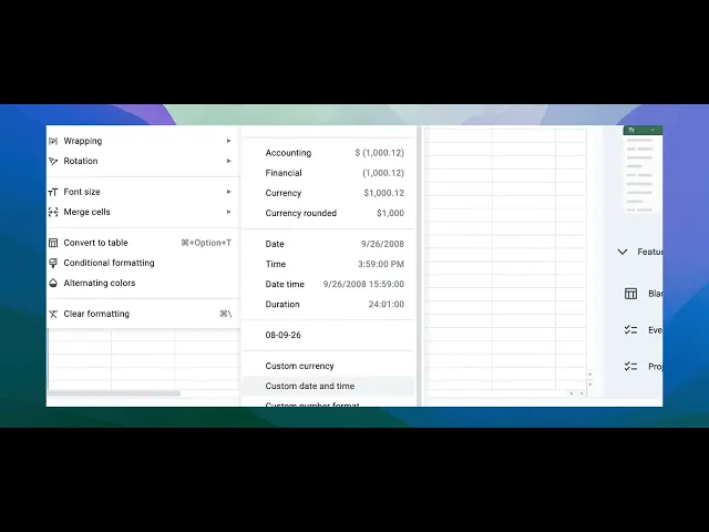Dentro del menú "Formato", pasa el ratón sobre "Número" y luego selecciona "Fecha y hora personalizada".