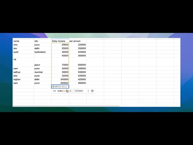 - Reemplace D2:D11 con el rango de celdas que desea sumar.Presione Enter para ver el resultado.