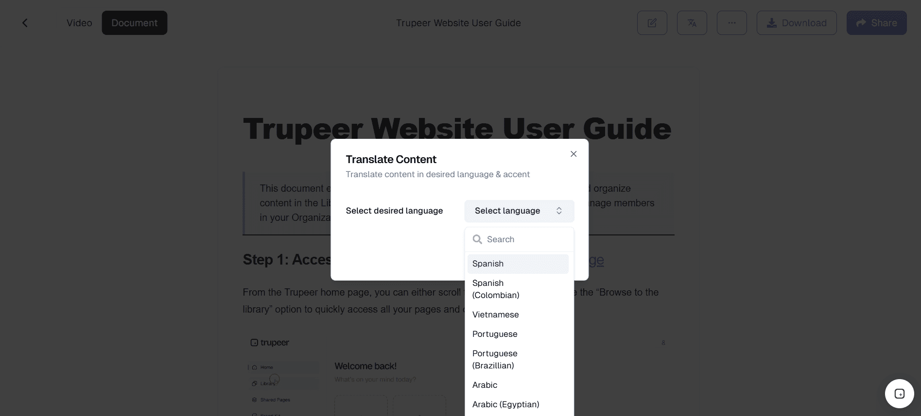 D'un clic, traduisez votre vidéo et votre guide écrit en plusieurs langues en utilisant la traduction par IA de Trupeer, puis révisez et approuvez avec des collaborateurs de langue maternelle.