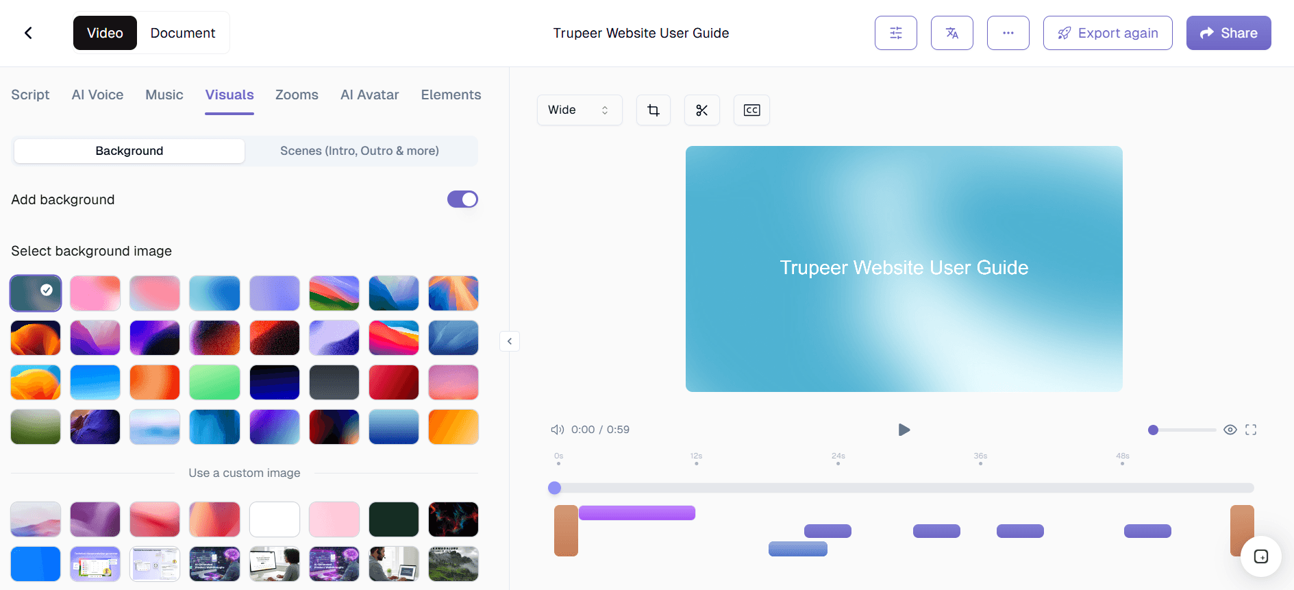 Upload background music, narration, or sound effects. You can also generate AI voiceovers directly inside Trupeer, allowing you to ai add sound to video free using text-to-speech technology.